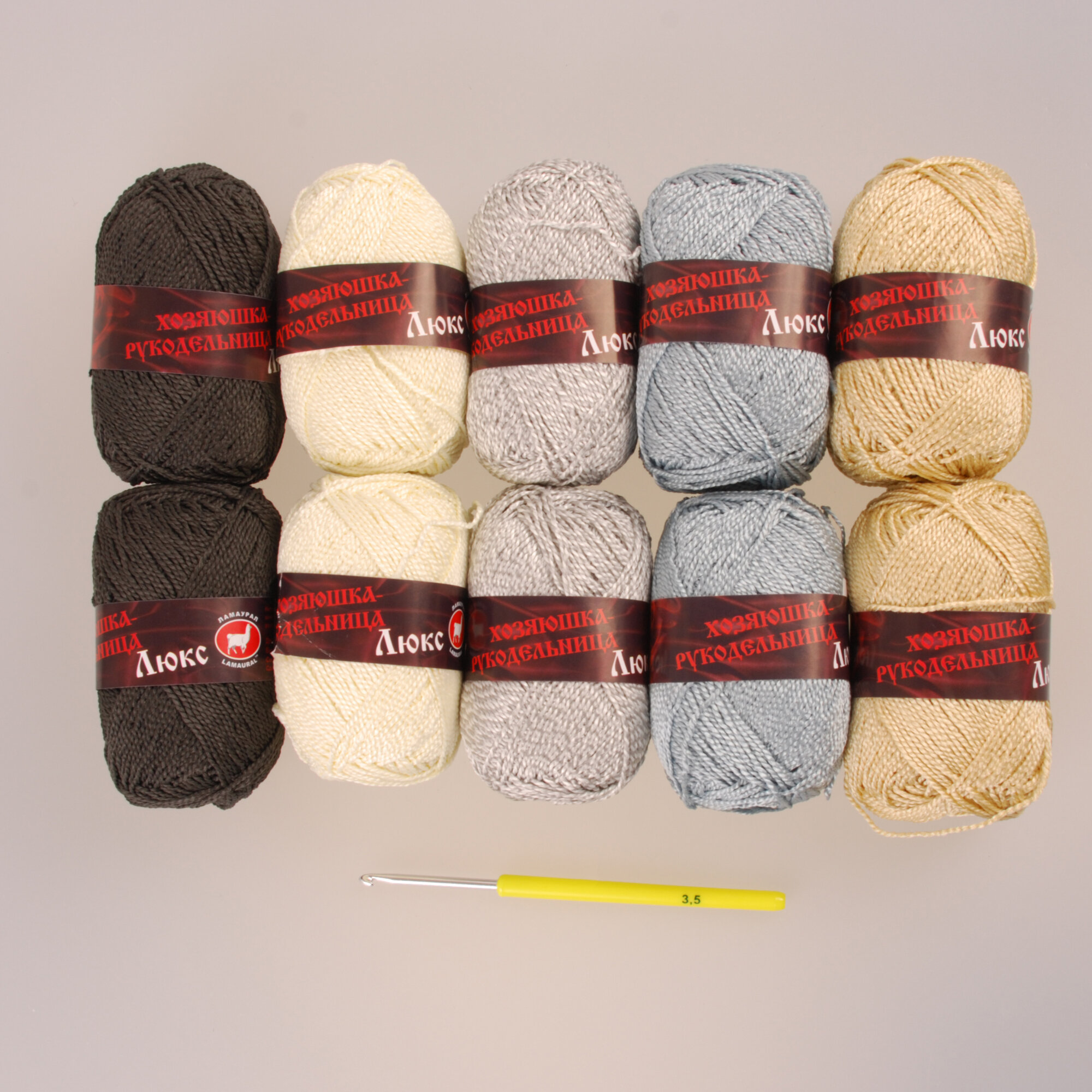 | Комплектация | 10 мотков пряжи Хозяюшка-рукодельница "Люкс", крючок для вязания №3 |