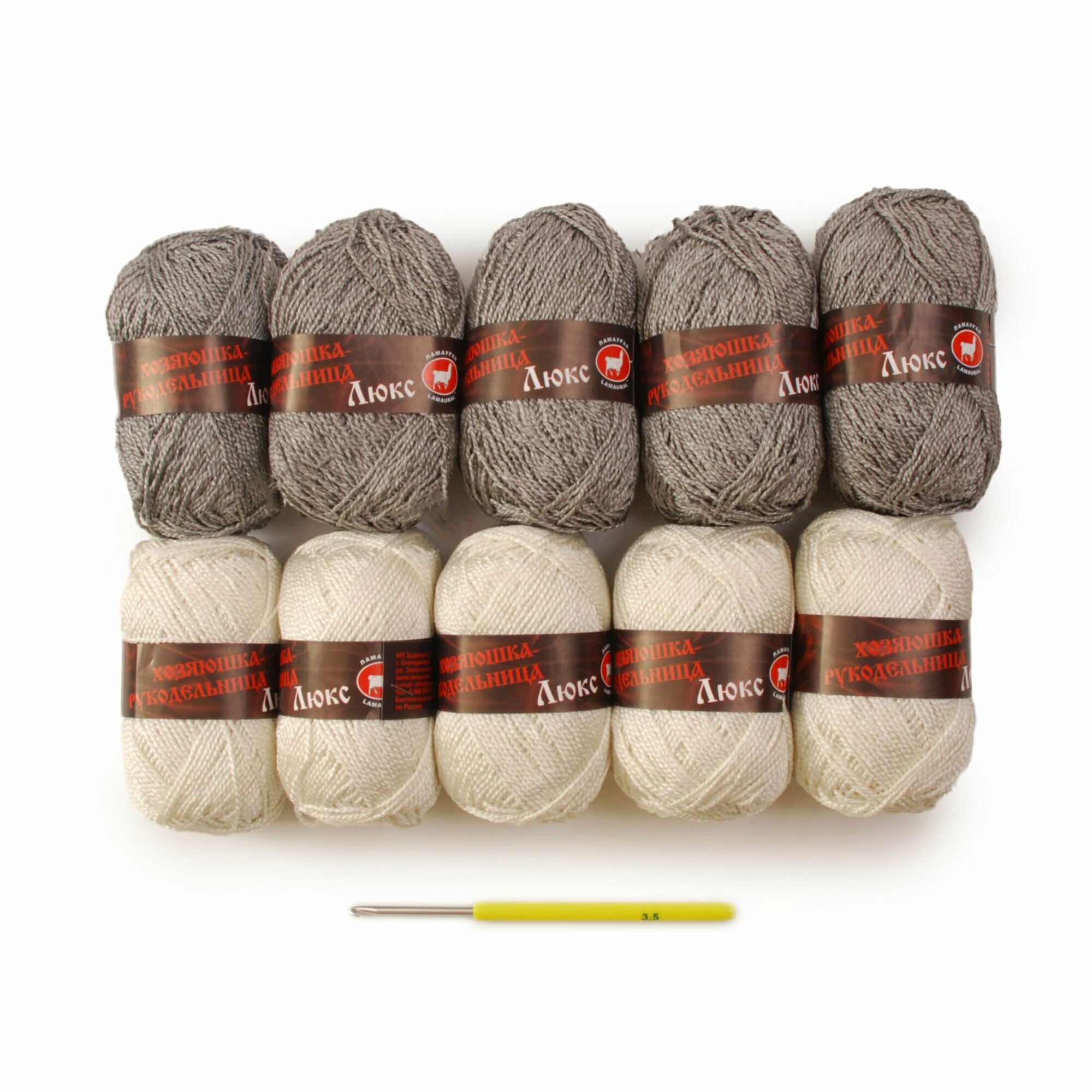| Комплектация | 10 мотков пряжи Хозяюшка-рукодельница "Люкс", крючок для вязания №3 |