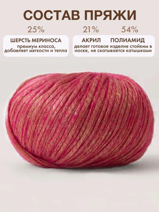 | Состав | 25% мериносовая шерсть / 21% акрил / 54% полиамид |