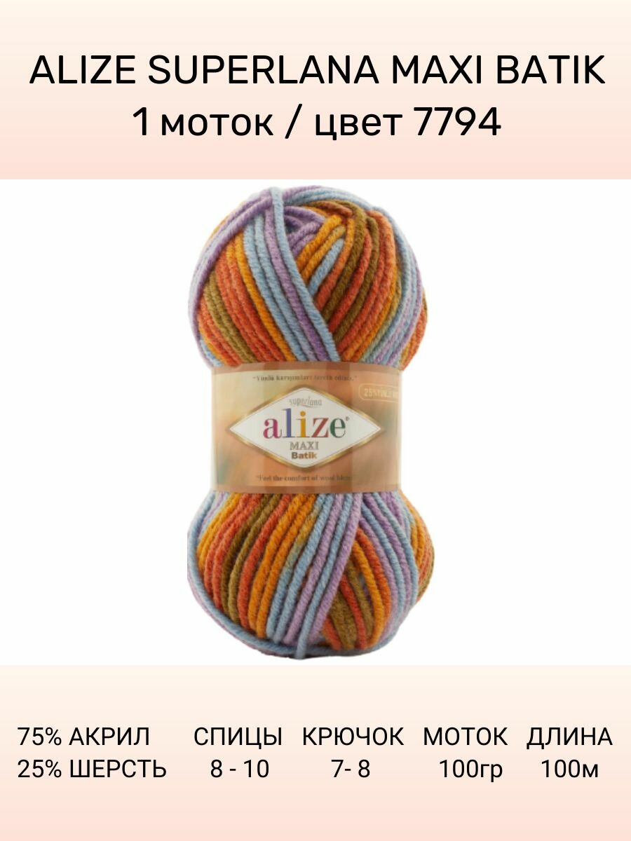 Отзывы на Пряжа Alize Superlana Maxi batik жёлтый-оранжевый-голубой-фиолетовый (7794), 25%шерсть/75%акрил, 100м, 100г, 1шт