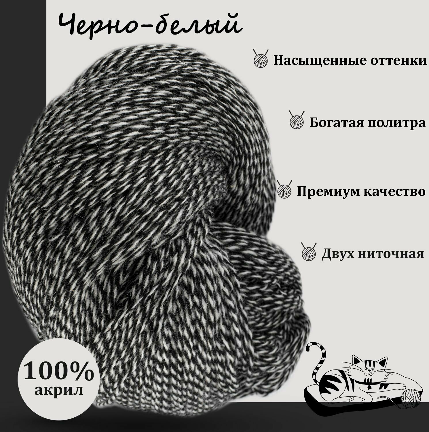 Карачаевская пряжа мягкая в пасмах нитки 100 % акрил для вязания 600-650м/250-280гр,Чёрно - белый информация: