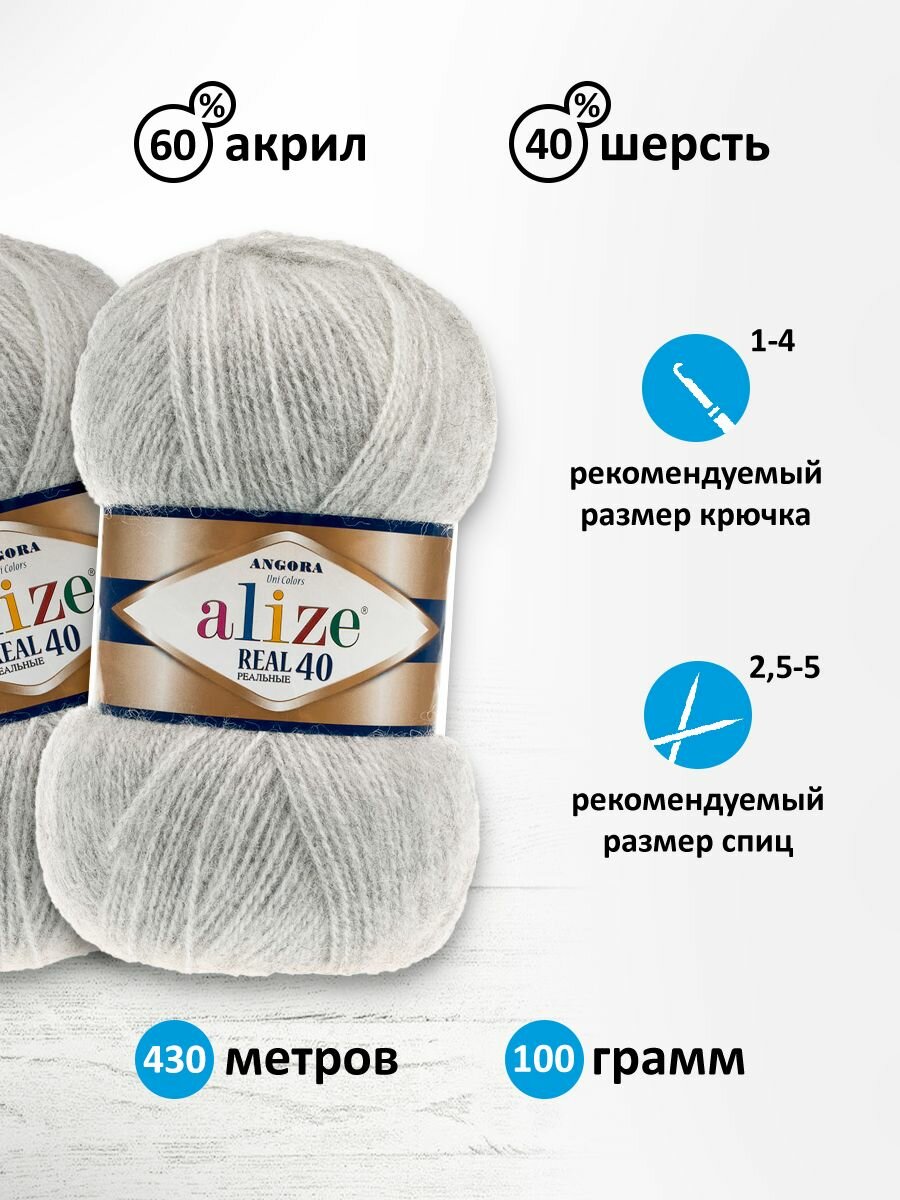 10 цен на Пряжа Alize Angora Real 40 серый меланж (614), 60%акрил/40%шерсть, 430м, 100г, 5шт