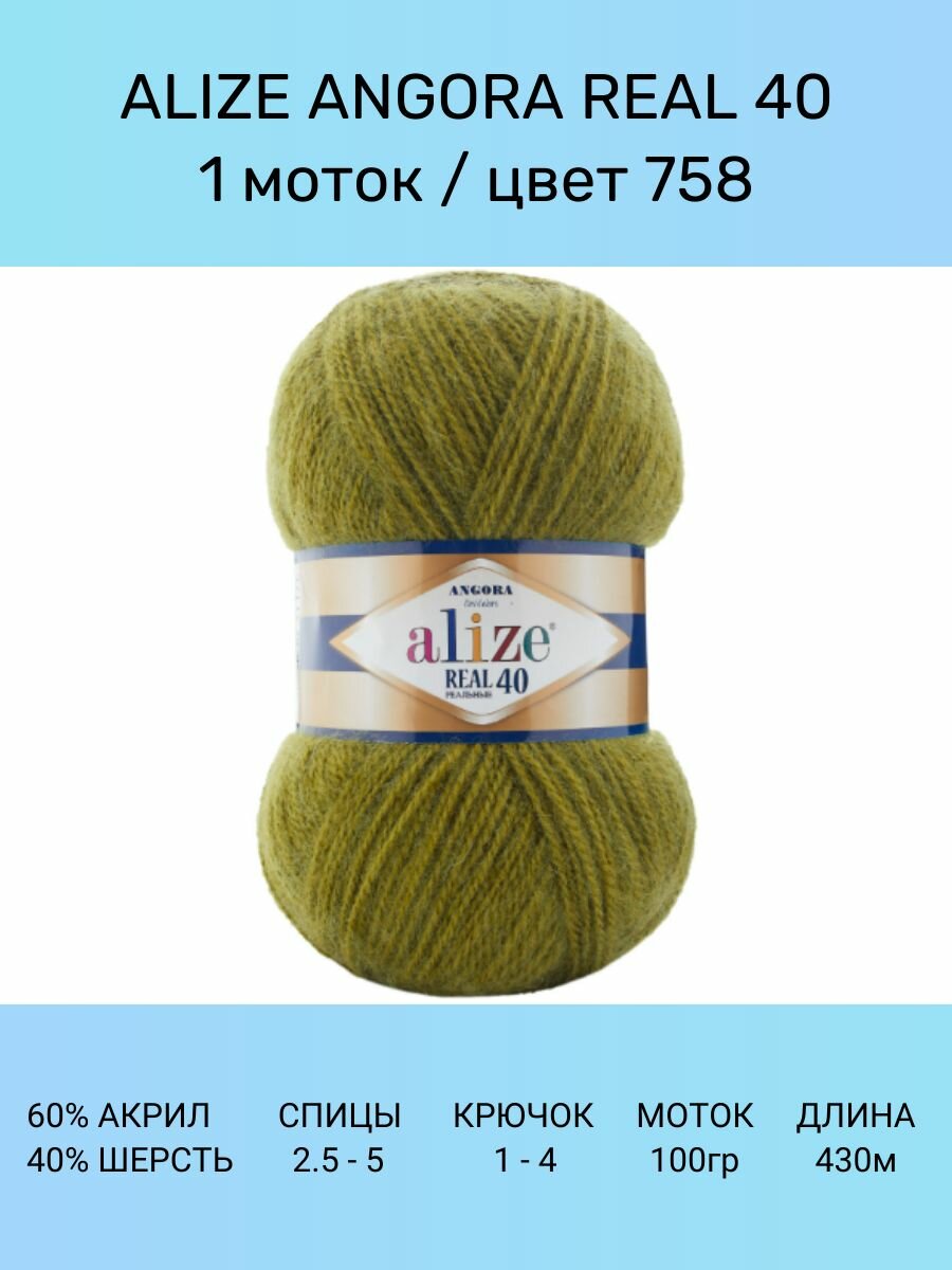 Пряжа Alize Angora Real 40 оливковый (758), 60%акрил/40%шерсть, 430м, 100г, 1шт информация: