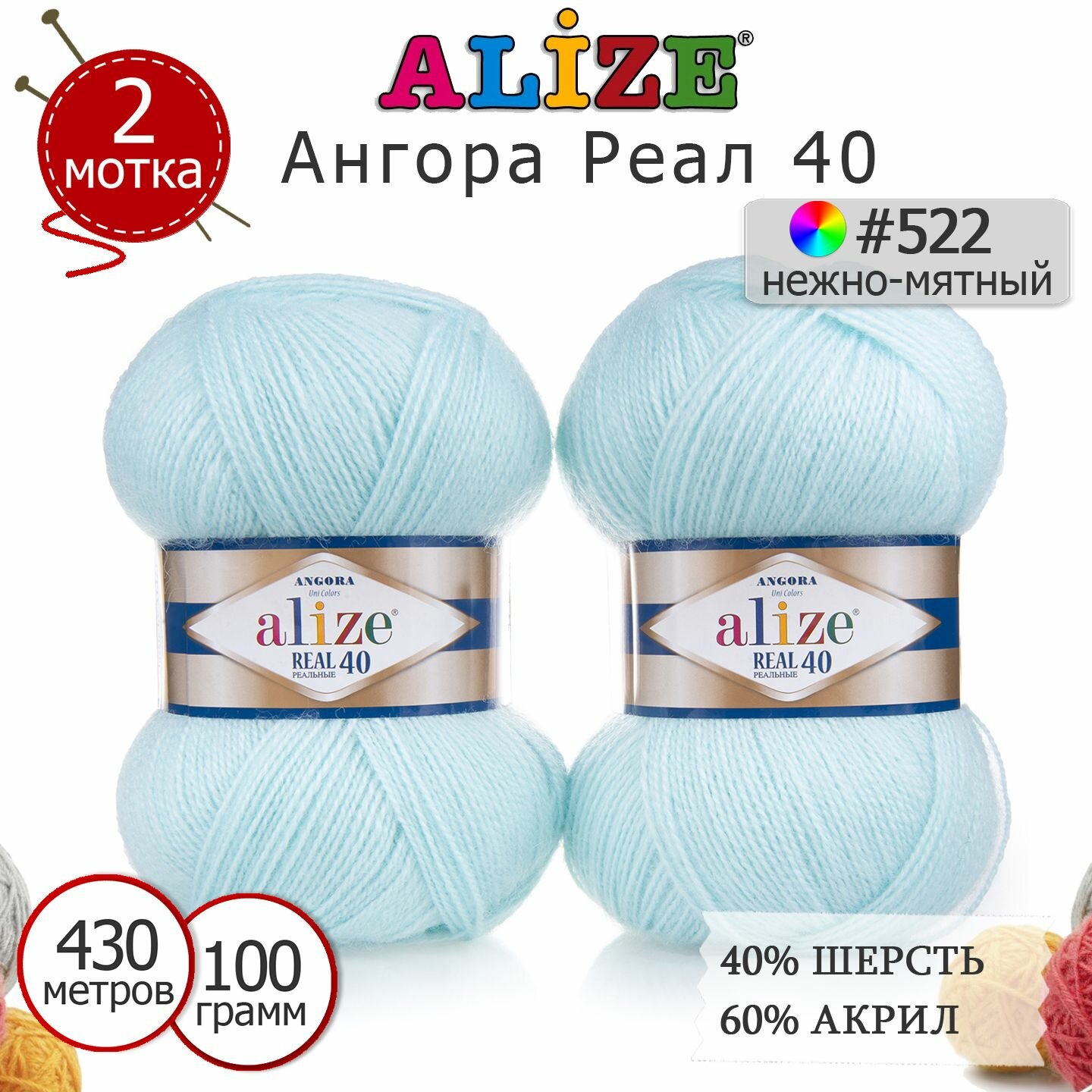 Пряжа Alize Angora Real 40 мята (522), 60%акрил/40%шерсть, 430м, 100г, 2шт информация: