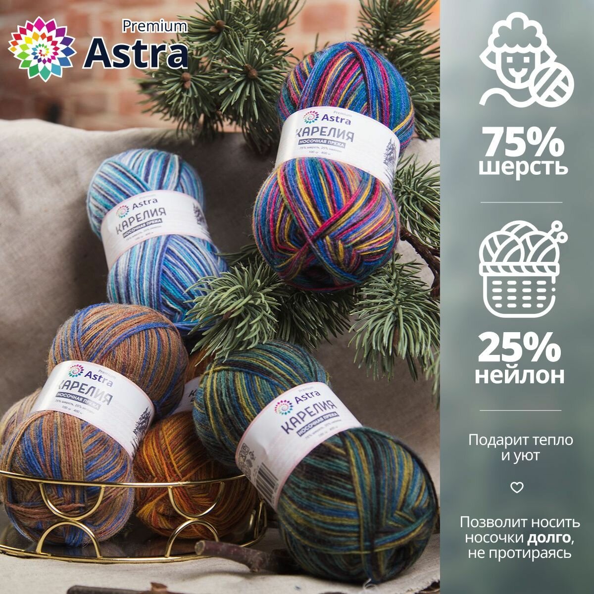 Пряжа для вязания Astra Premium 'Карелия' носочная (Karelia sock), 100г, 400м (75% шерсть, 25% нейлон) (1002), 2 мотка информация: