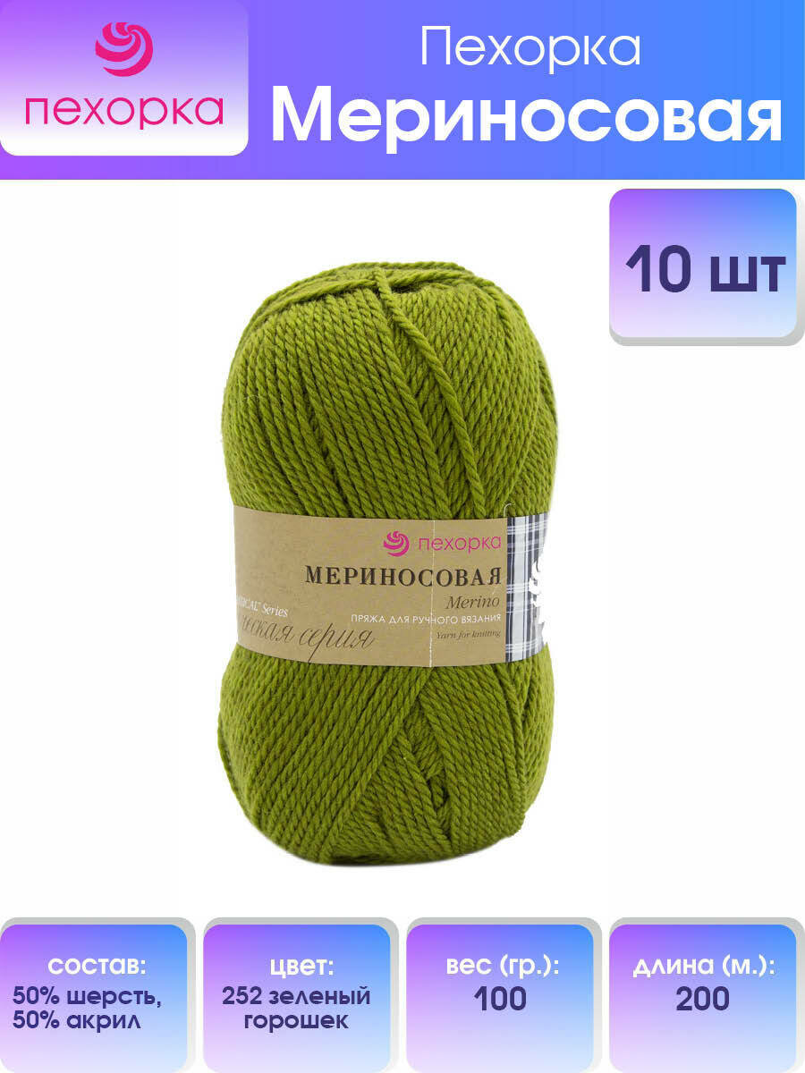 Пряжа Пехорка "Мериносовая" - 1 шт, цвет: 252-Зеленый горошек, 200м/100г, 50% мериносовая шерсть, 50% акрил