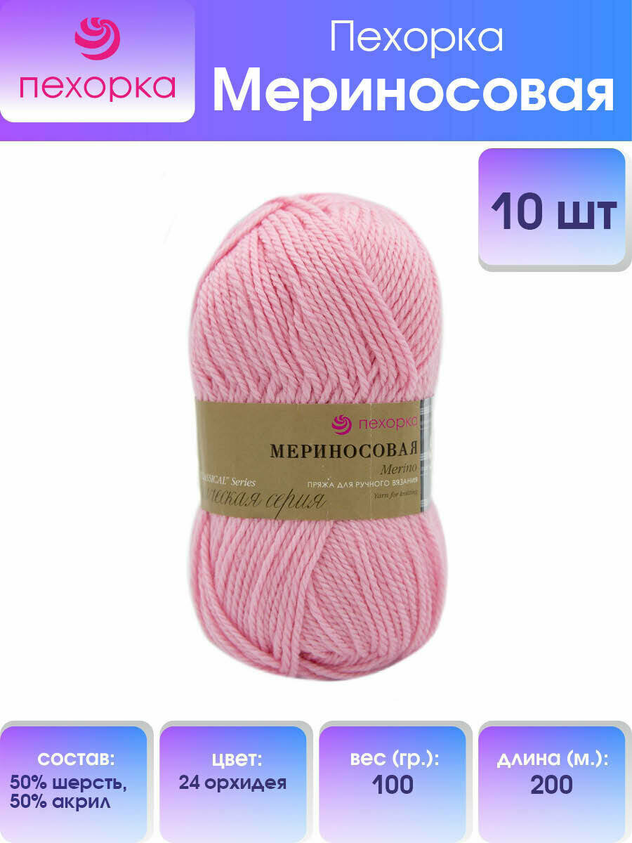 Пряжа для вязания Пехорка 'Мериносовая', 100г, 200м (50% шерсть, 50% акрил) (24-Орхидея), 10 мотков информация: