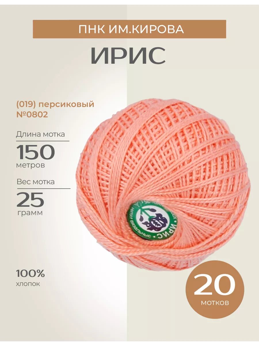 Нитки для вязания крючком ПНК им. Кирова 'ирис' (100% хлопок) 25г, 150м (1602 абрикосовый), 20 мотков