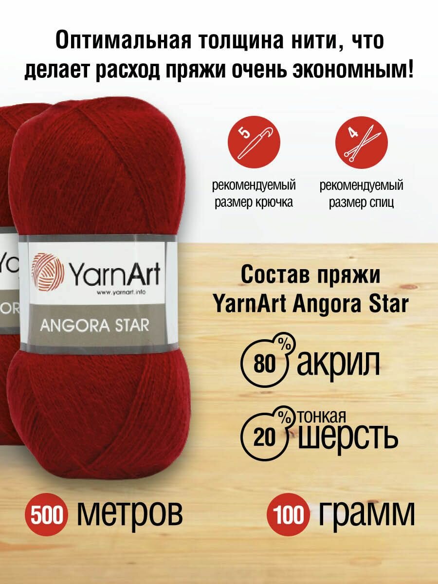 Пряжа для вязания YarnArt 'Angora Star' 100г, 500м (20% тонкая шерсть, 80% акрил) (3024 темнокрасный), 5 мотков 1 104 ₽