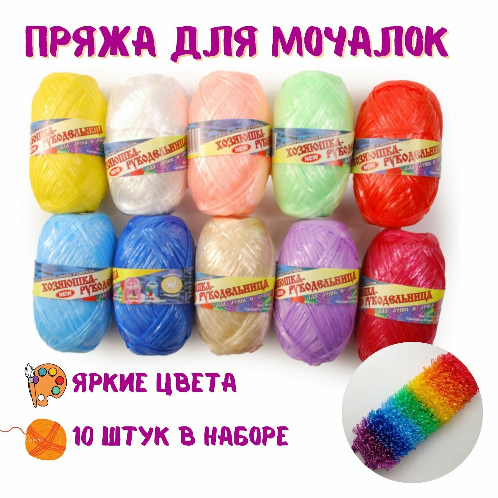 Пряжа для вязания мочалок/ Хозяюшка-рукодельница Для души и душа, №62 ассорти, 50 г, 180 м, 10 шт