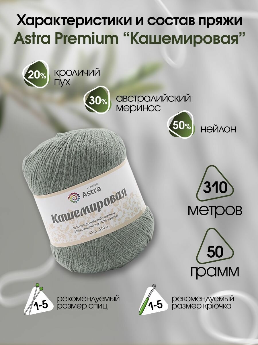 Отзывы на Пряжа для вязания Astra Premium 'Кашемировая' (Cashmere), 50г, 310м (20% кроличий пух, 30% австралийский меринос, 50% нейлон) + нить 20г (942 полынь)
