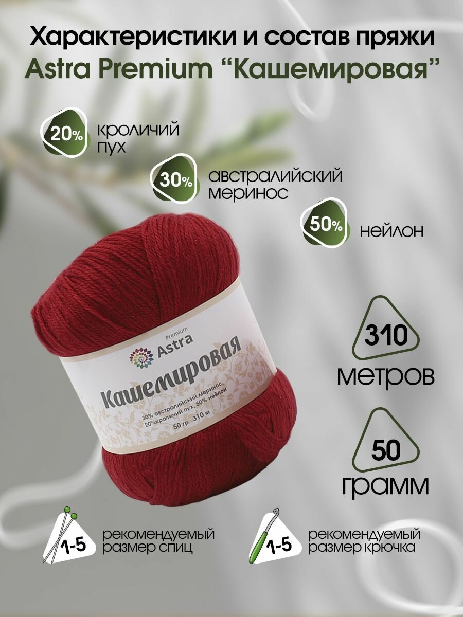 Отзывы на Пряжа для вязания Astra Premium 'Кашемировая' (Cashmere), 50г, 310м (20% кроличий пух, 30% австралийский меринос, 50% нейлон) + нить 20г (162 красный)