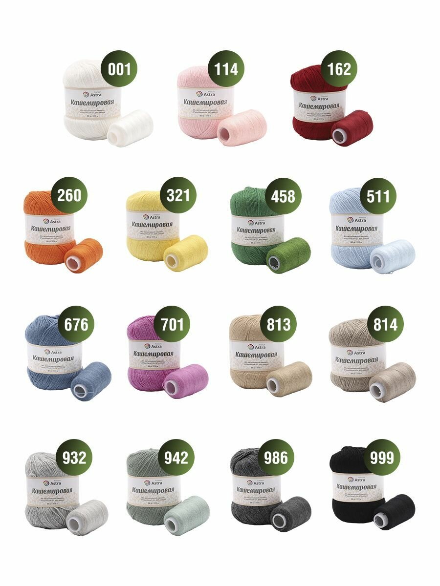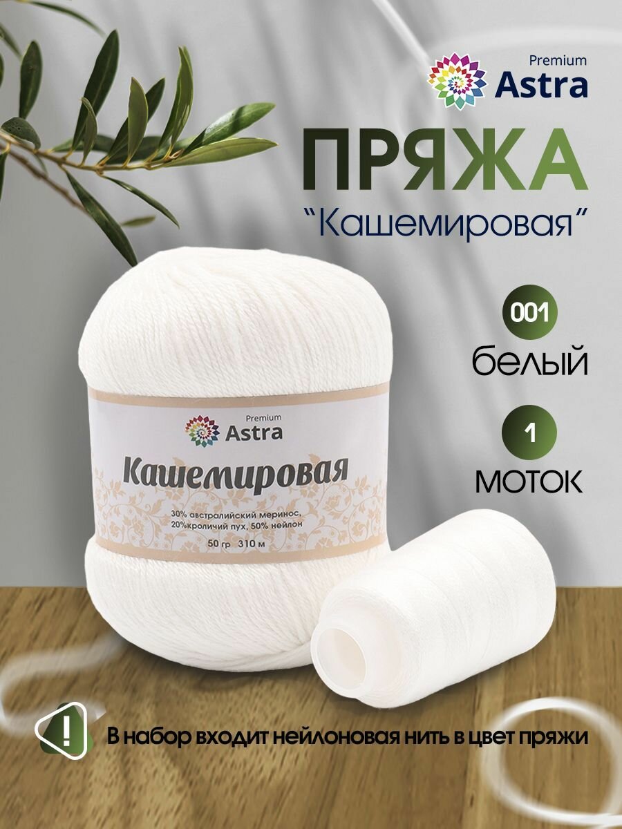 10 цен на Пряжа для вязания Astra Premium 'Кашемировая' (Cashmere), 50г, 310м (20% кроличий пух, 30% австралийский меринос, 50% нейлон) + нить 20г (001 белый)