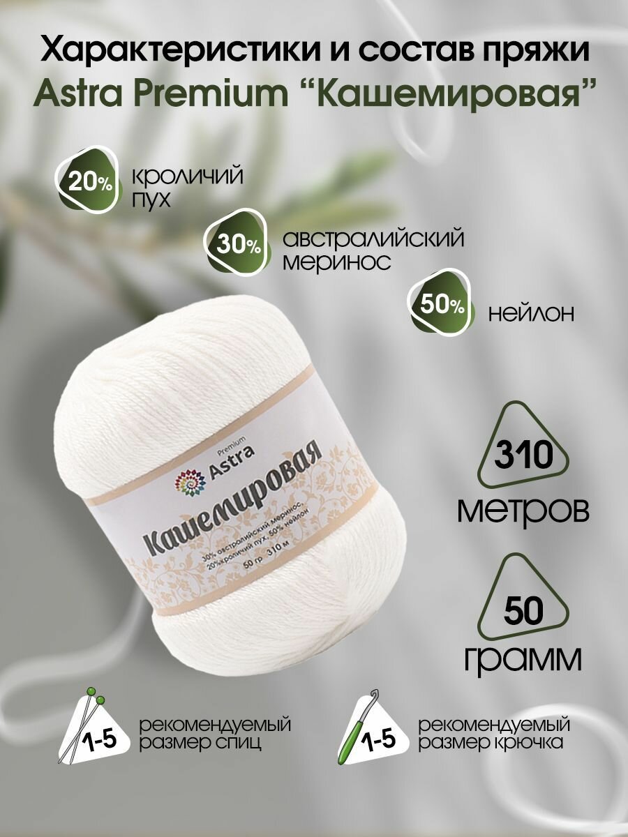 Отзывы на Пряжа для вязания Astra Premium 'Кашемировая' (Cashmere), 50г, 310м (20% кроличий пух, 30% австралийский меринос, 50% нейлон) + нить 20г (001 белый)