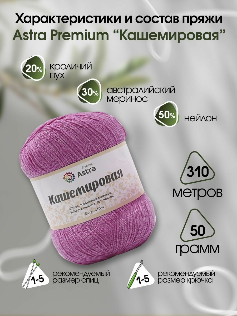 Отзывы на Пряжа для вязания Astra Premium 'Кашемировая' (Cashmere), 50г, 310м (20% кроличий пух, 30% австралийский меринос, 50% нейлон) + нить 20г (701 розово-фиолетовый)