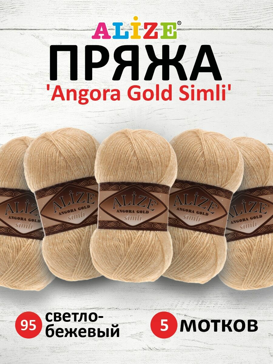 Пряжа для вязания ALIZE 'Angora Gold Simli', 100г, 500м (20% шерсть, 5% металлик, 75% акрил) (95 светло-бежевый), 5 мотков информация: