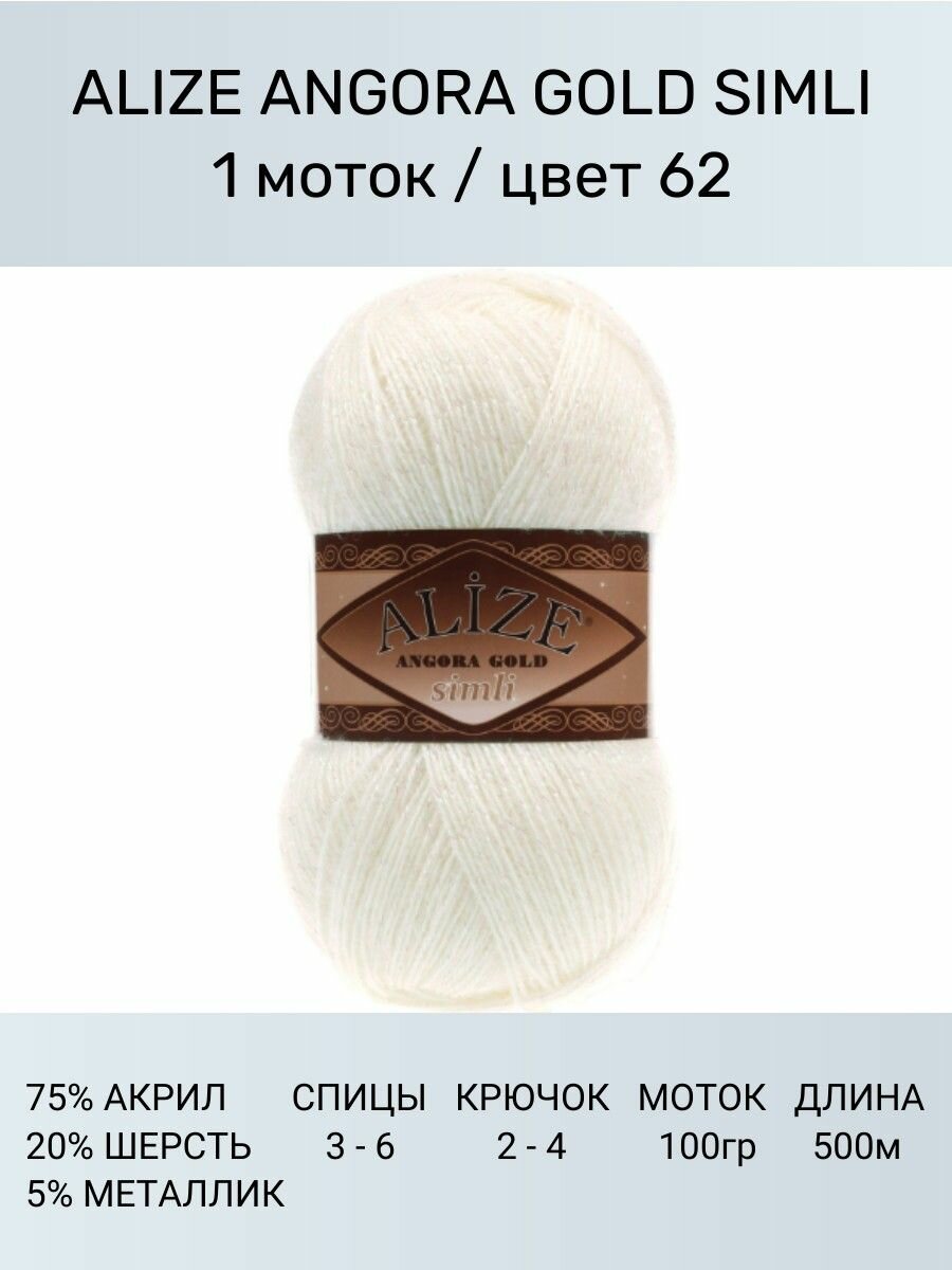 Пряжа Alize Angora Gold simli молочный (62), 75%акрил/20%шерсть/5%метанит, 500м, 100г, 1шт информация: