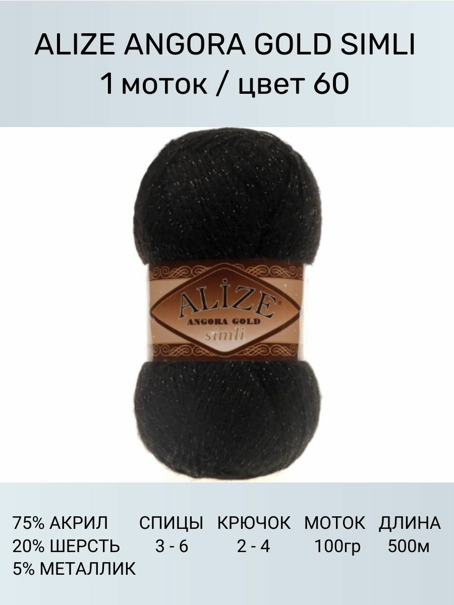 Пряжа Alize Angora Gold Simli (20% шерсть, 75% акрил, 5% металлик) 100 гр, 500 м, 60 черный , 1 моток