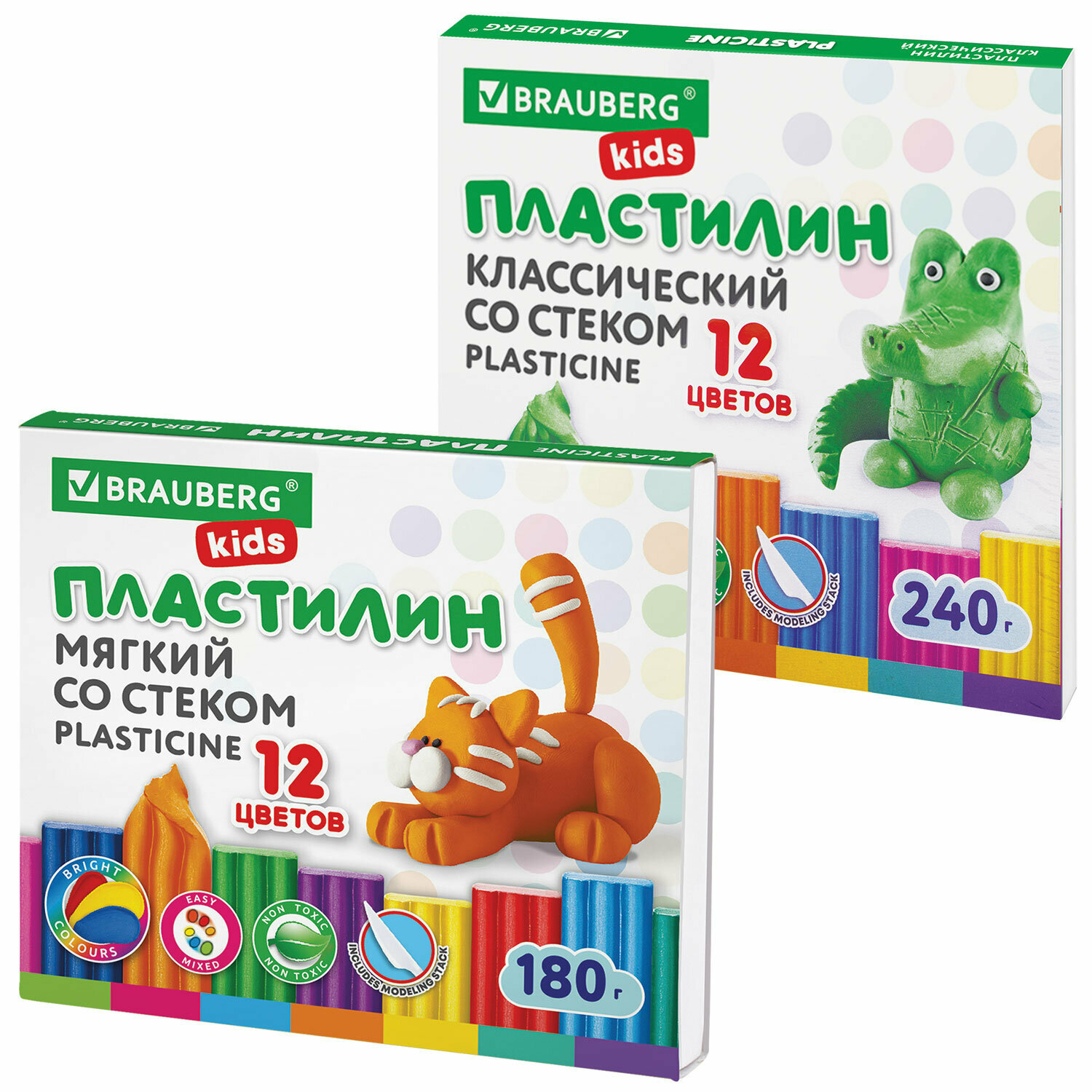 Отзывы на Пластилин для лепки детский 2 набора по 12 цветов, мягкий классический в школу, 420 грамм, со стеком, Brauberg Kids, 880568