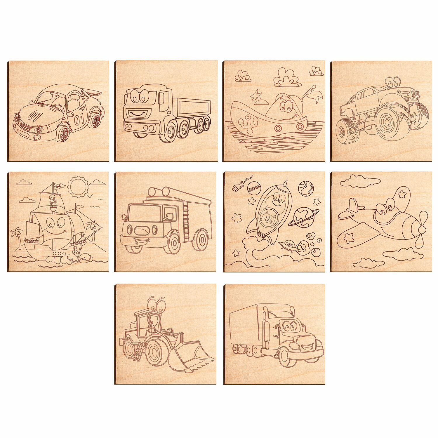 Доски деревянные для выжигания Транспорт, 5 шт., 10 рисунков, 15*15см, BRAUBERG HOBBY