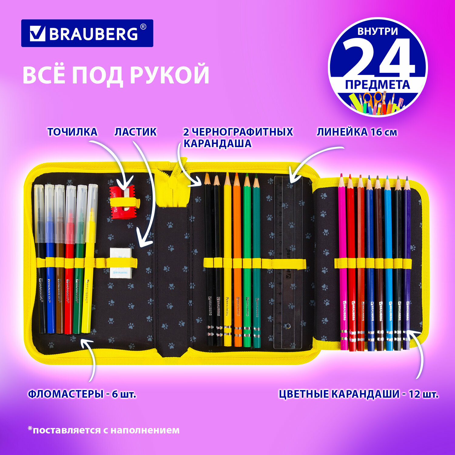 Пенал Brauberg с наполнением, 1 отделение, 1 откидная планка, 24 предмета, 21х14 см, Dark cat, 272351 информация: