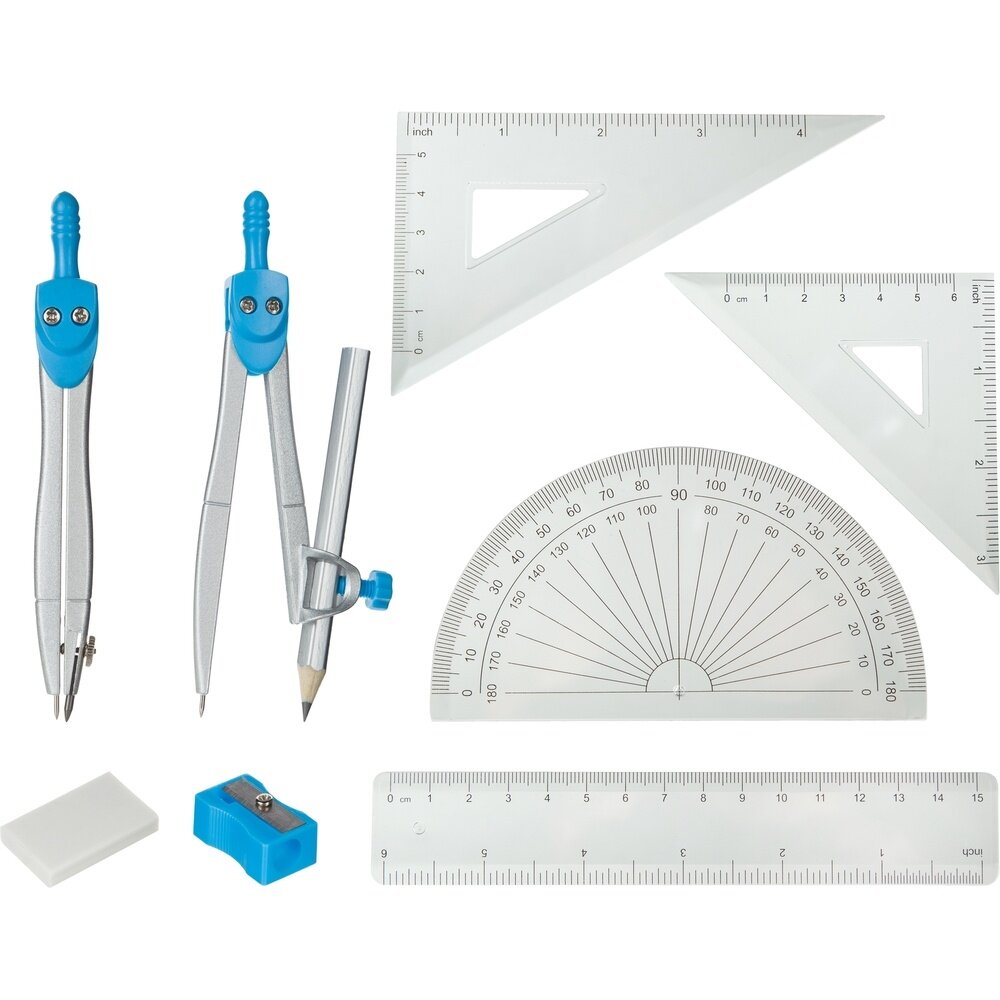 | Комплектация | Циркуль — 2 шт. Запасной грифель Линейка — 1 шт. Треугольник — 2 шт. Транспортир — 1 шт. Карандаш — 1 шт. Точилка — 1 шт. Ластик — 1 шт. |