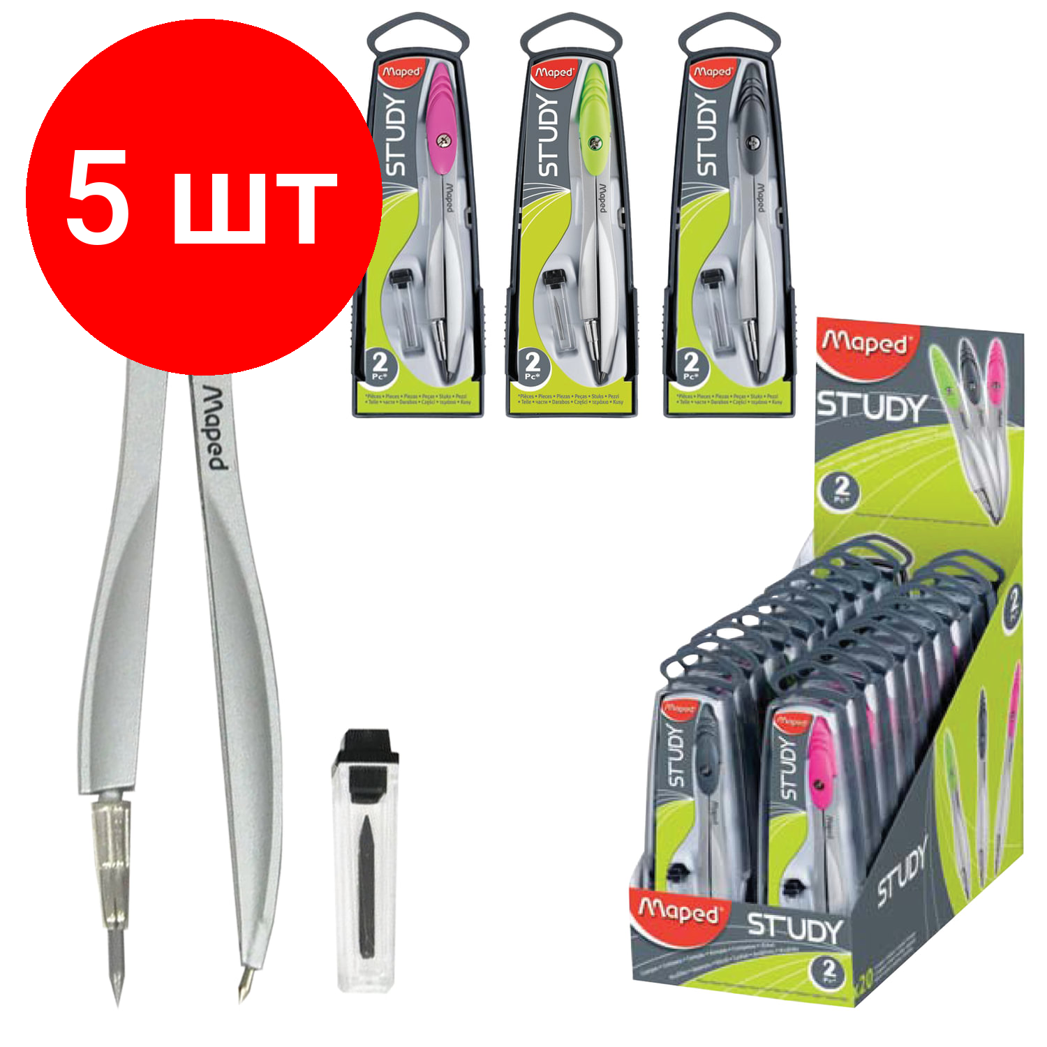 Комплект 5 шт, Циркуль MAPED"Study", 120 мм, металлический, грифель 2 мм, ассорти, пенал с европодвесом, 119450 информация: