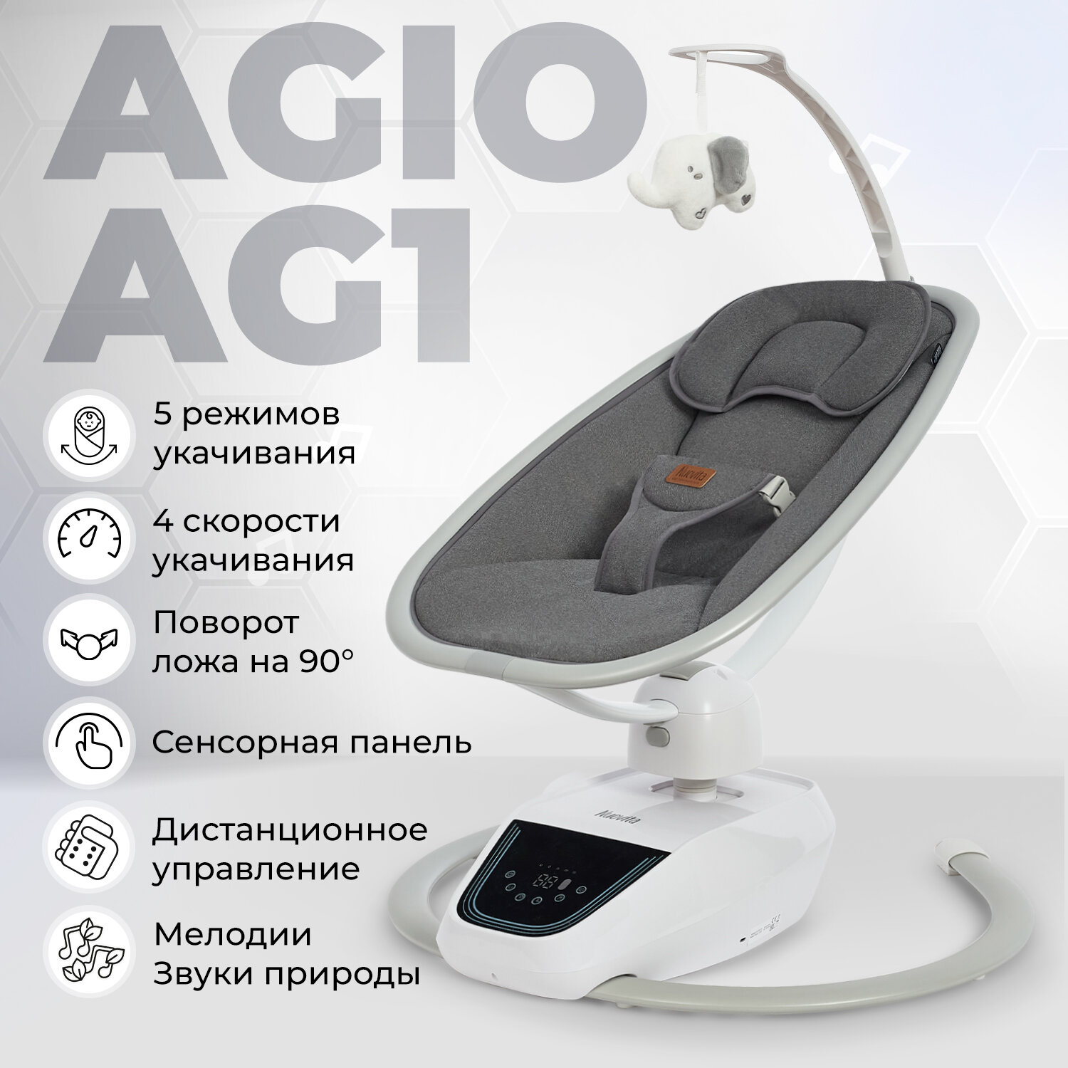 | Дополнительная информация | Из других преимуществ электронной качели для новорожденных Agio AG1 — возможность регулировки наклона сиденья: от 103° (с углом наклона спинки в 120°) до 113° (с углом наклона спинки в 130°). Электрокачель-шезлонг рассчитана на новорожденных младенцев в возрасте от 0 до 6 месяцев, а значит, эта характеристика имеет для них принципиальное значение: в период, когда мышцы и связки малыша слабы и несовершенны, физиологически правильное положение тела особенно важно. Обеспечить его также помогает удобная подуона позволяет ровно уложить головку во избежание различных деформаций шейного отдела позвоночника. |