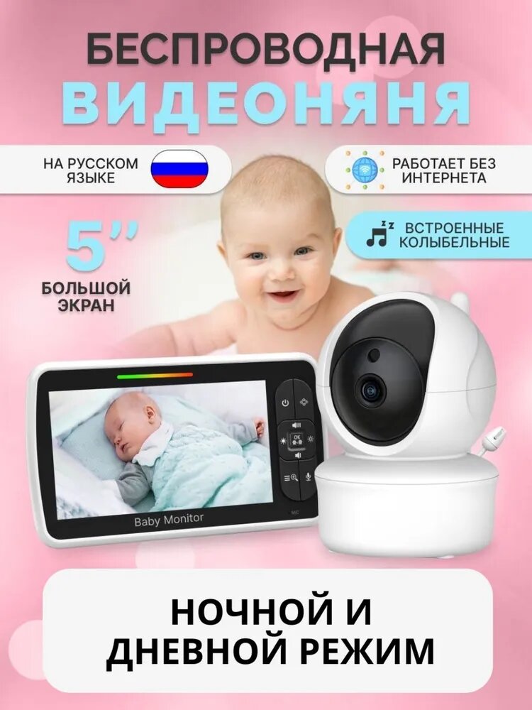 Видеоняня беспроводная поворотная цветной экран 5 дюймов высокого разрешения c двусторонней аудиосвязью режим ночного видения информация: