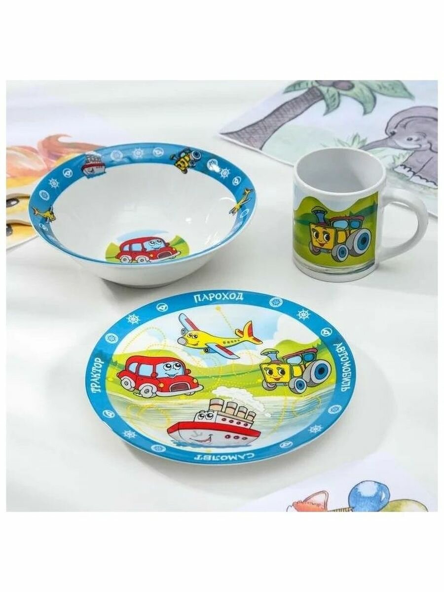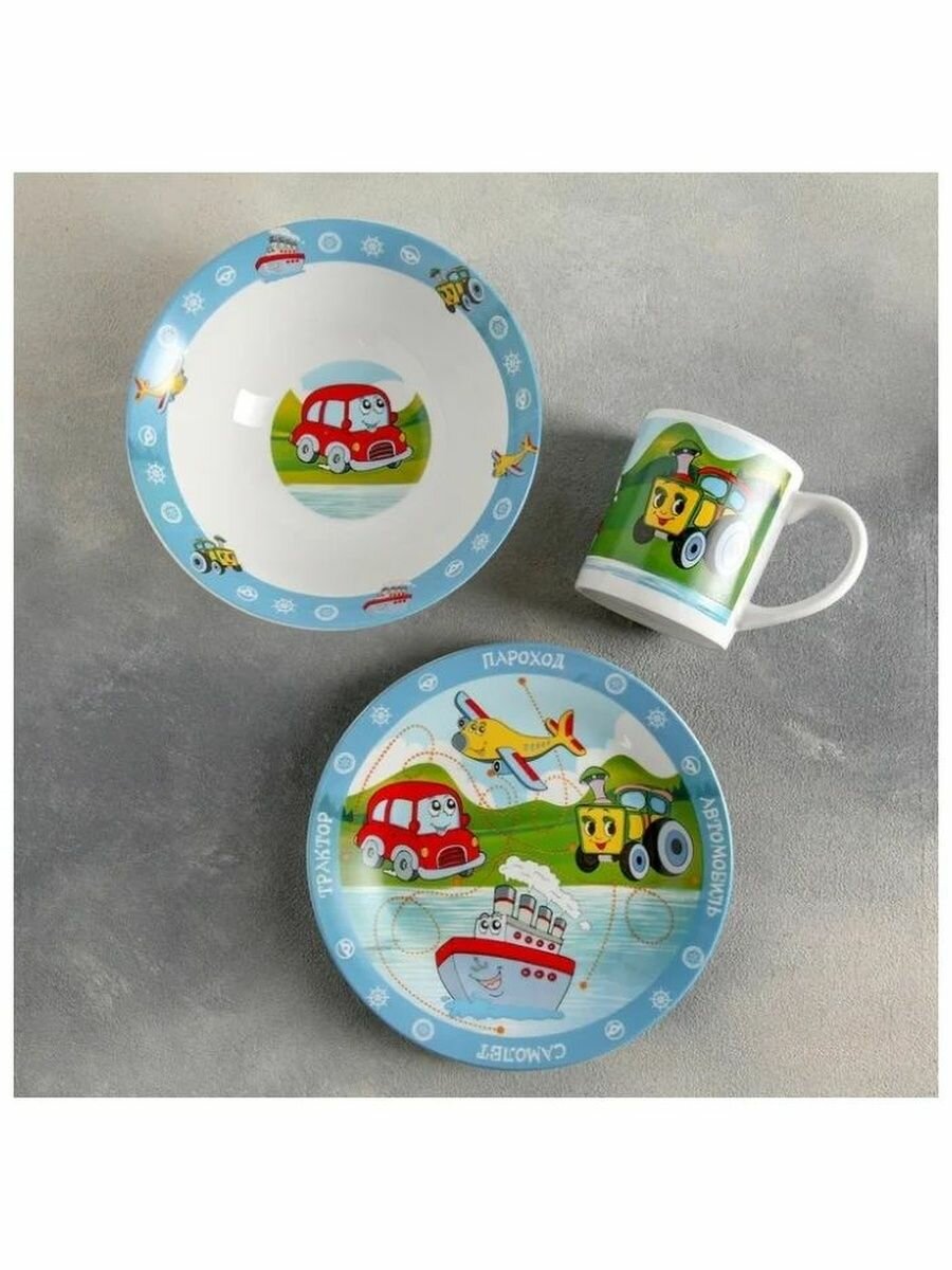 Набор "Транспорт" 3 предмета (тарелка 19 см, миска 18 см, кружка 240 мл) в подарочной упаковке