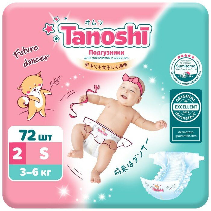 Tanoshi Подгузники для детей, размер S 3-6 кг, 72 шт.