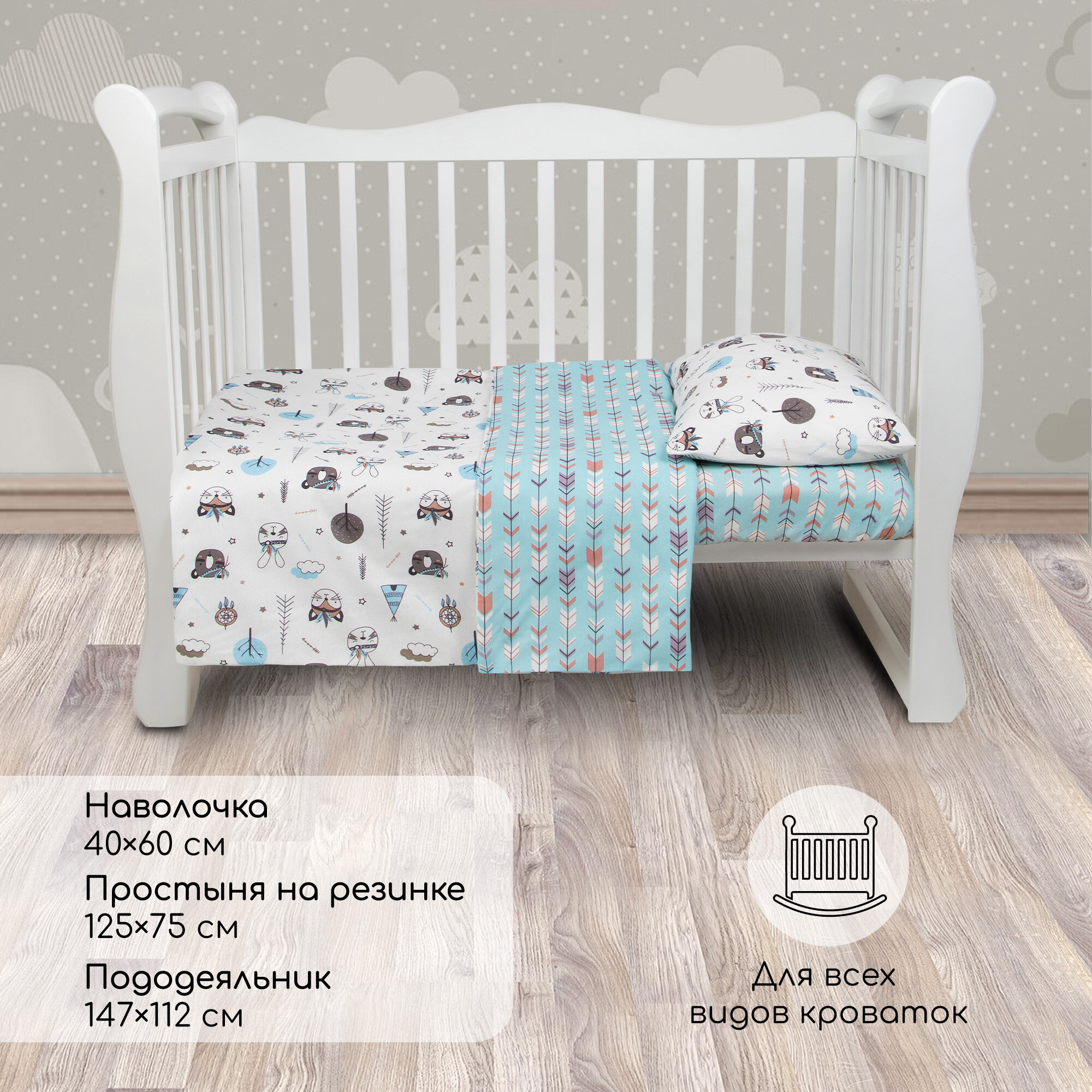 | Комплектация | простыня универсальная на резинке (на матрасы прямоугольник и овал) 125 x 75см - 1шт, наволочка 40 x 60см - 1шт, пододеяльник 147 x 112 см - 1шт |