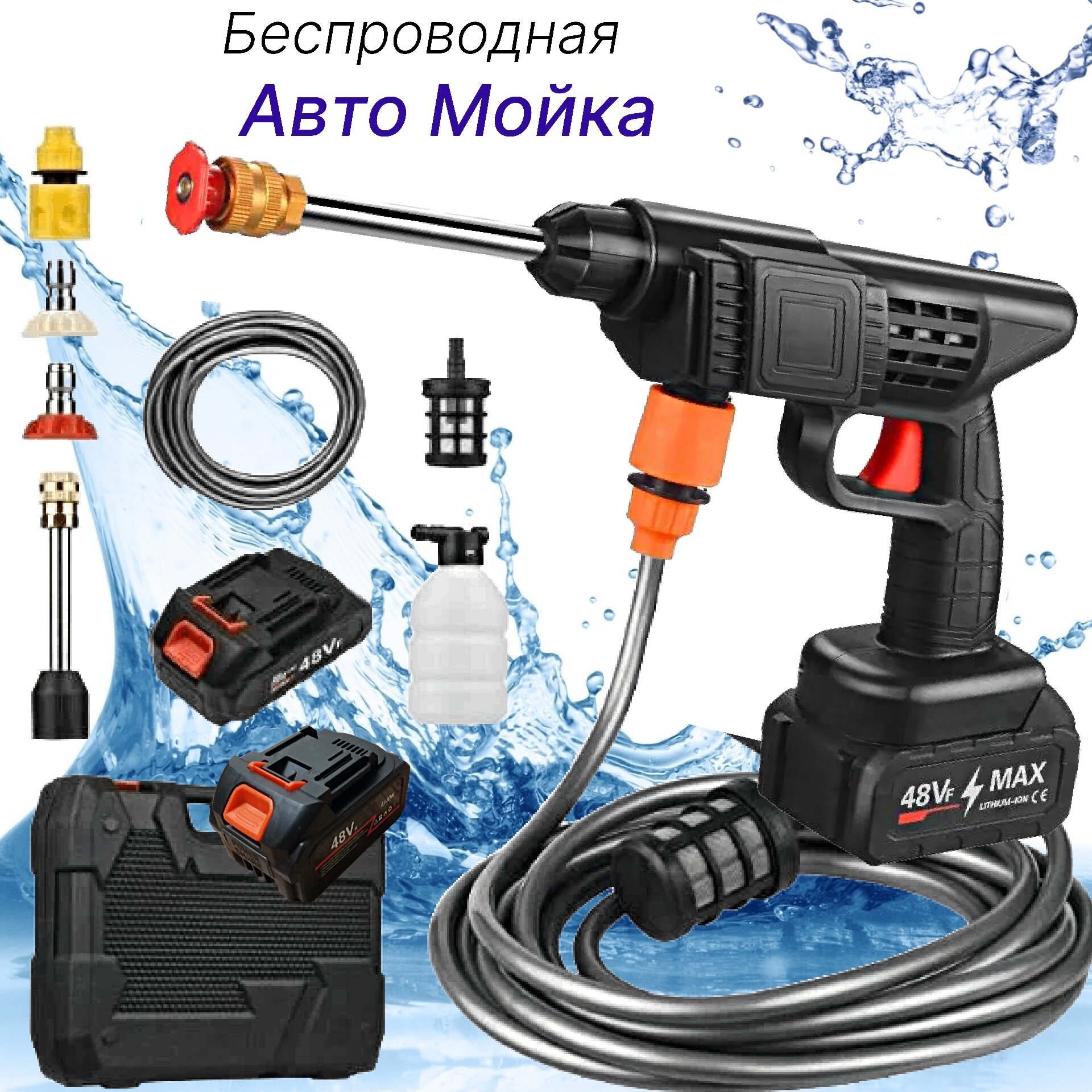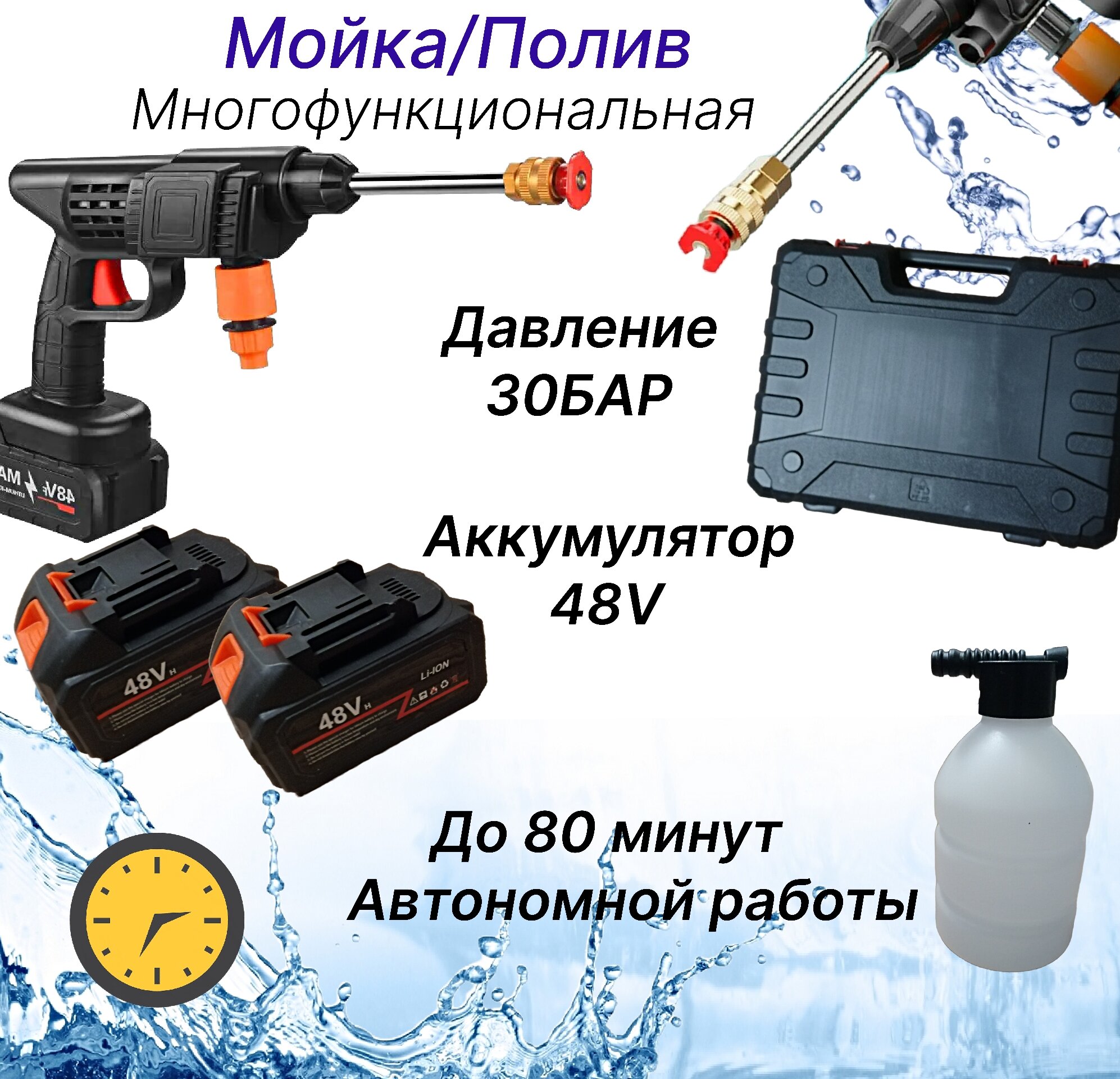 Автомойка высокого давления 48V, 2 аккумулятора, в кейсе / Мини мойка для автомобиля, вело и мото транспорта беспроводная, портативная информация: