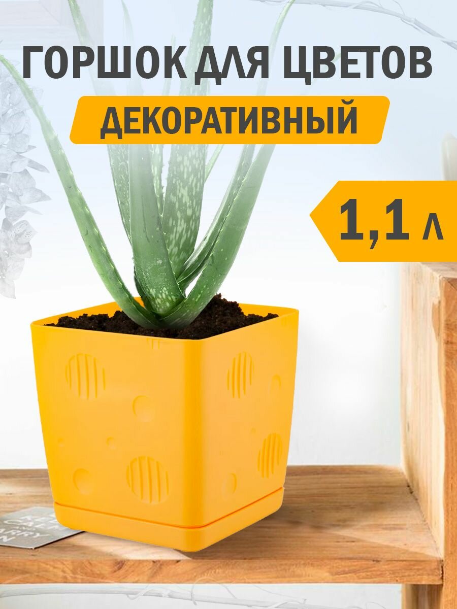 Горшок для цветов 1,4л (ДхШхВ) 14,5х14,5х13,2 см с дренажной сеткой и съемным поддоном, горшок цветочный, кашпо для цветов уличное