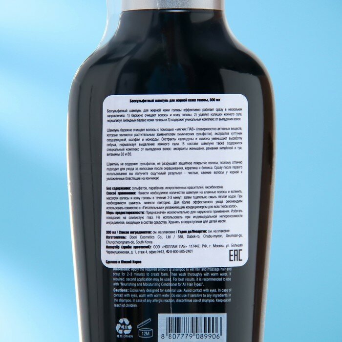 Шампунь бессульфатный NOLLAM LAB для жирной кожи головы, 300 мл информация: