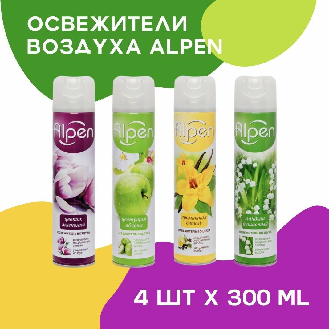 10 цен на Набор 4 шт освежитель воздуха Alpen ароматная ваниль, цветок магнолии, ландыш душистый, цветущая яблоня (300 мл*4)