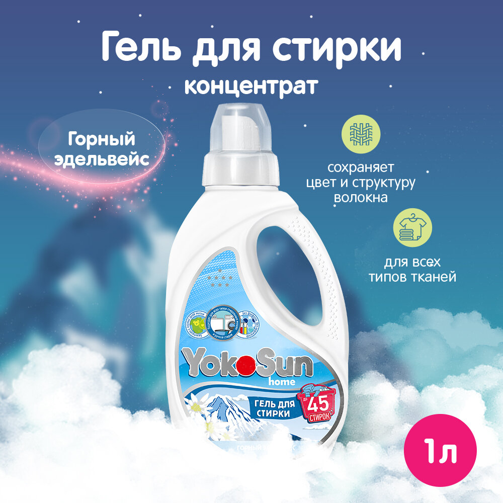 Гель для стирки YokoSun, Горный эдельвейс, 1л / Гипоаллергенный концентрированный универсальный жидкий стиральный порошок для белых и цветных вещей, для всех типов тканей, без хлора и фосфатов, эко, подходит с рождения информация: