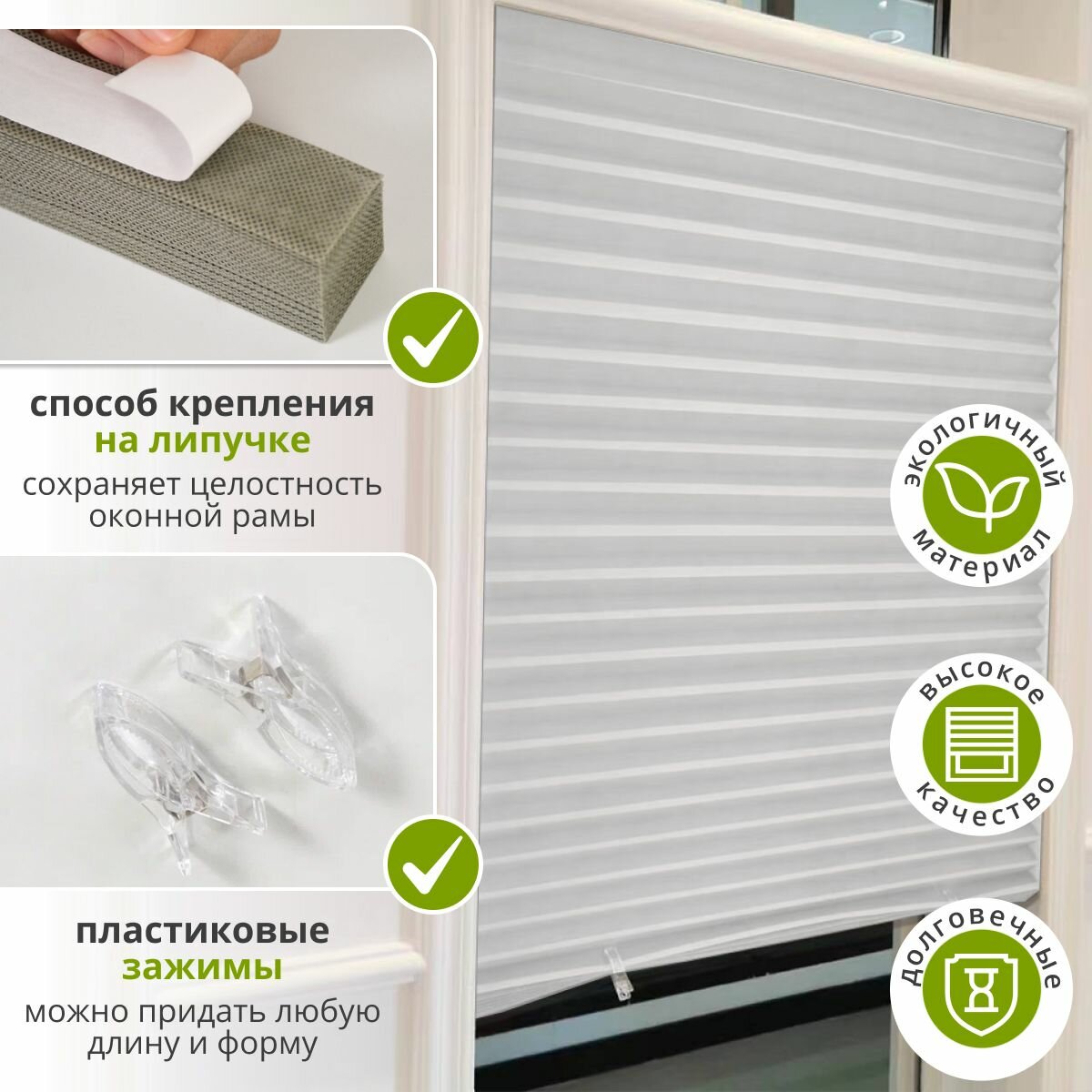 10 цен на Жалюзи плиссе самоклеящаяся 60х180 см. (1 шт) белый. Тканевые на липучке с зажимами и нижними фиксаторами