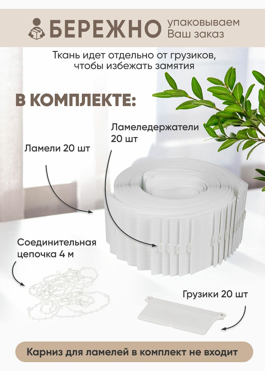 | Комплектация | Тканевые ламели – 30 шт, Ламеледержатель – 30 шт, Грузик – 30 шт, Нижняя соединительная цепочка |