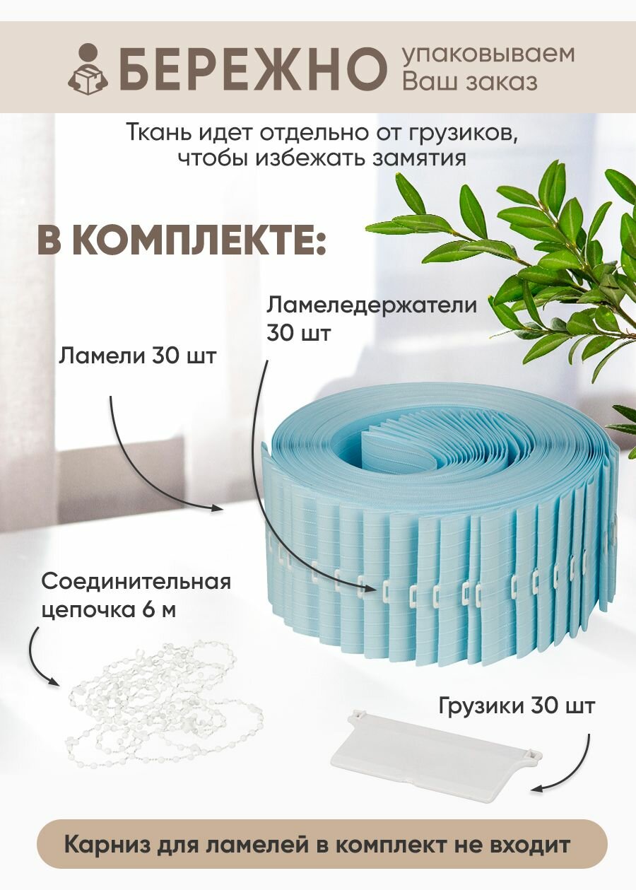 | Комплектация | Тканевые ламели – 30 шт, Ламеледержатель – 30 шт, Грузик – 30 шт, Нижняя соединительная цепочка |