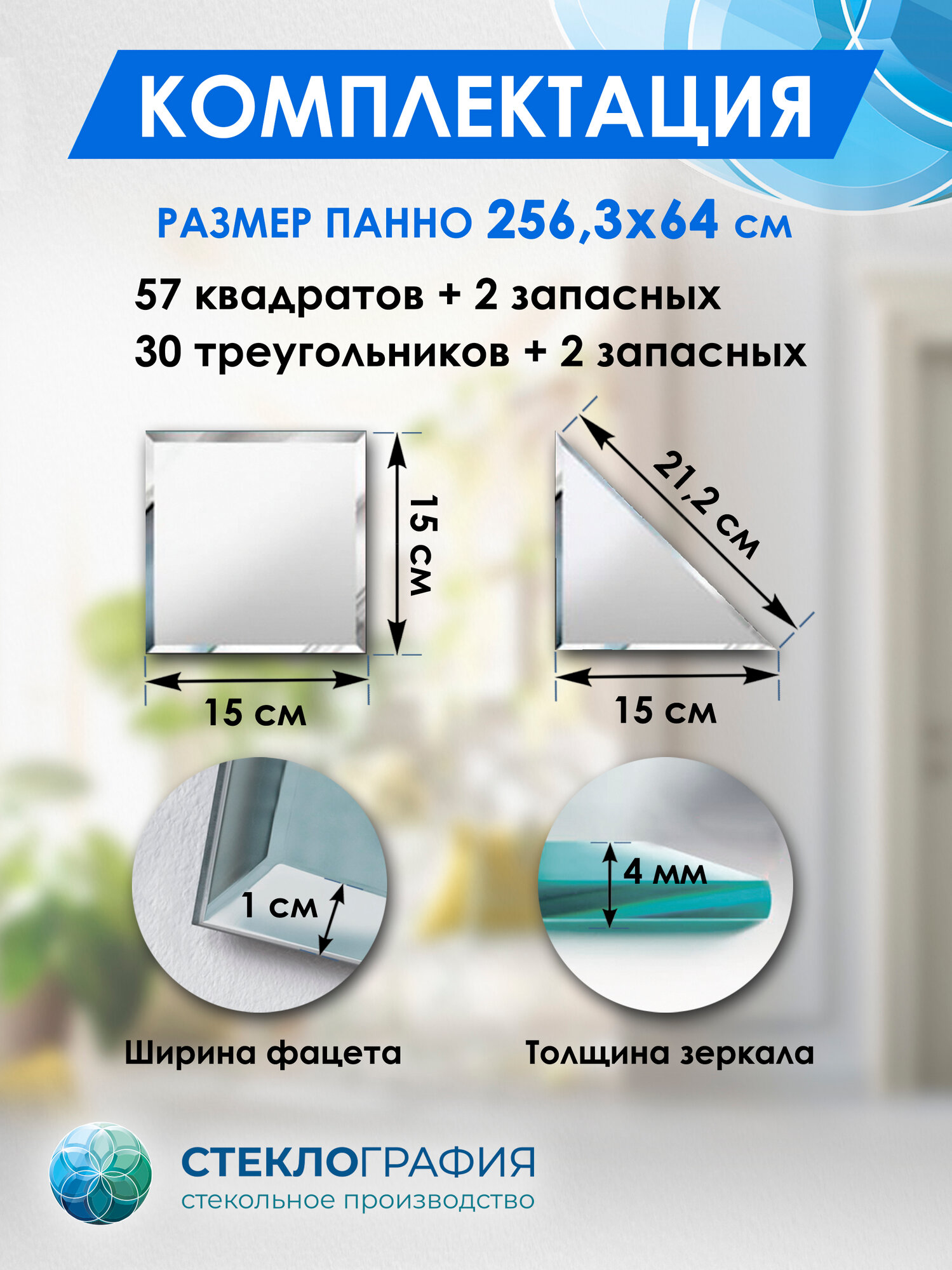 Зеркальное панно "Стеклография" с фацетом, на стену 255,5 см. х 51 см. зеркальная плитка из квадратов и треугольников. 6 727 ₽