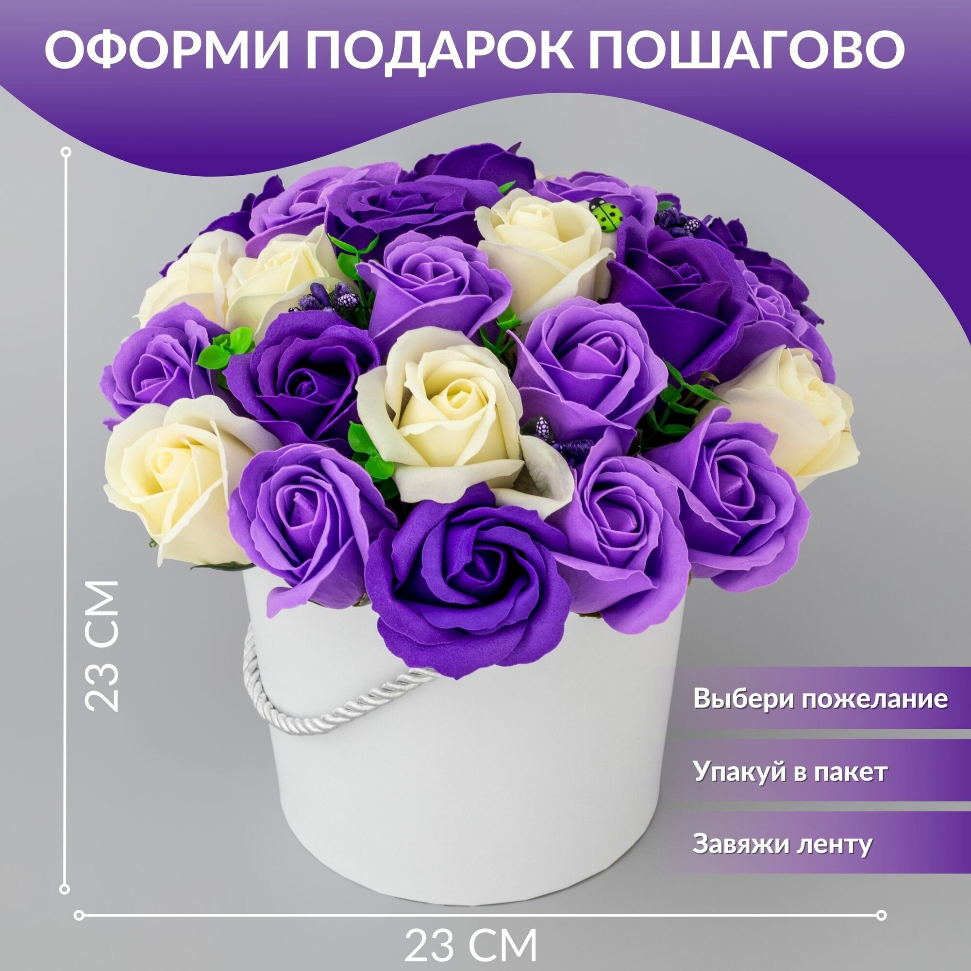 | Подробная комплектация | мыльные розы, шляпная коробка, открытка, лента для банта, пленка, стикеры для вазы |