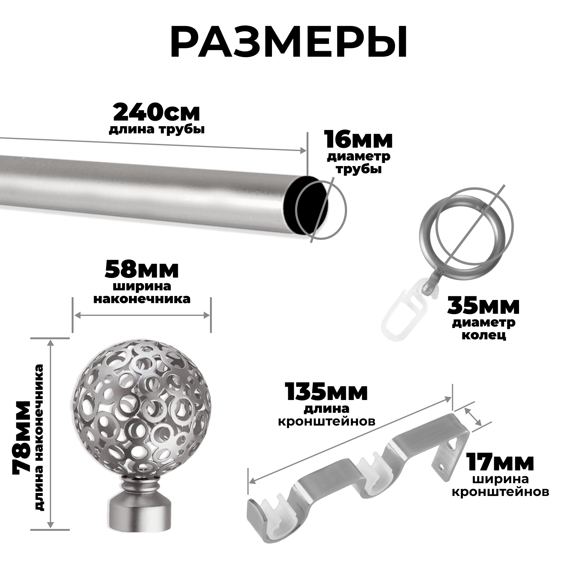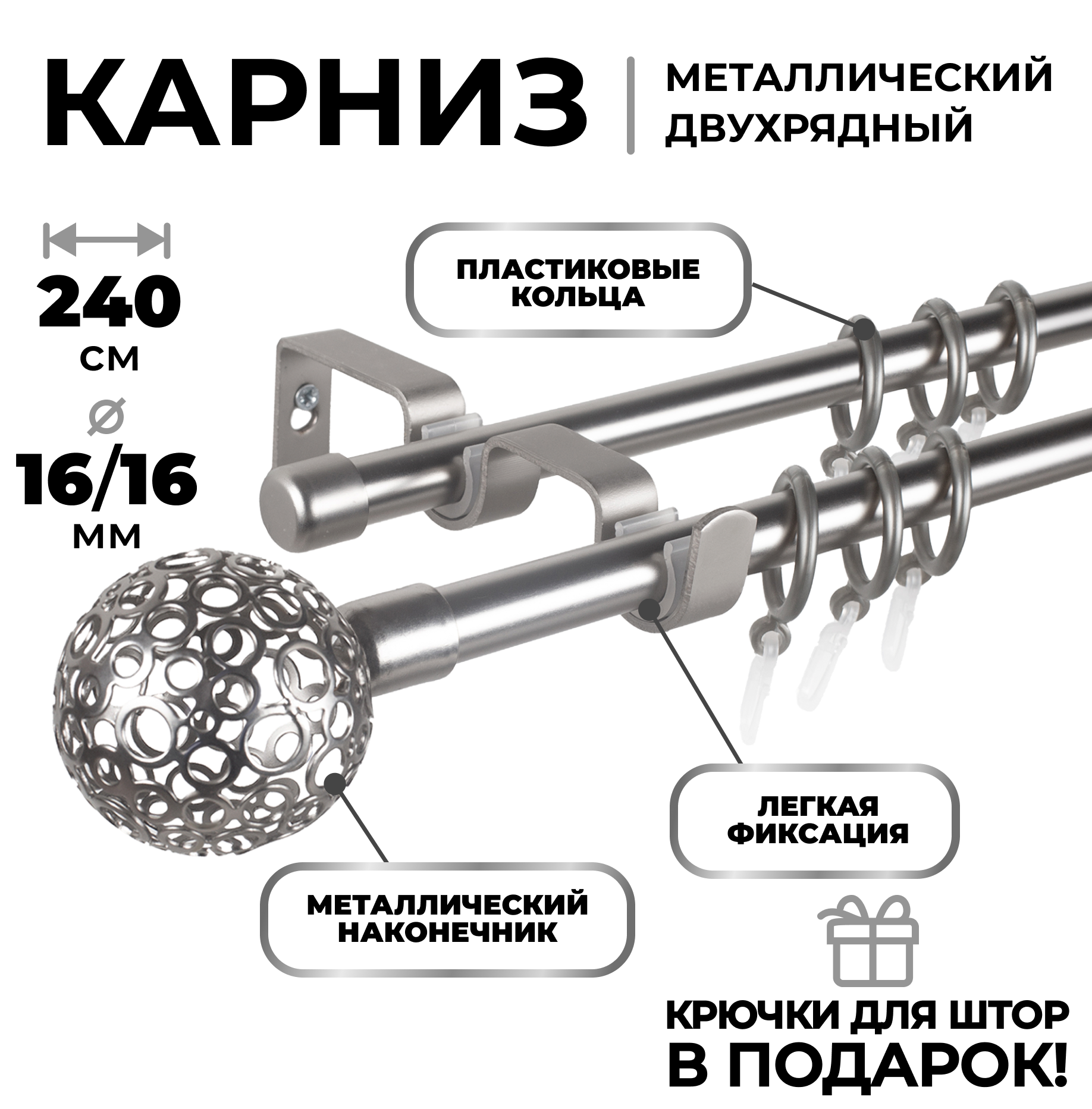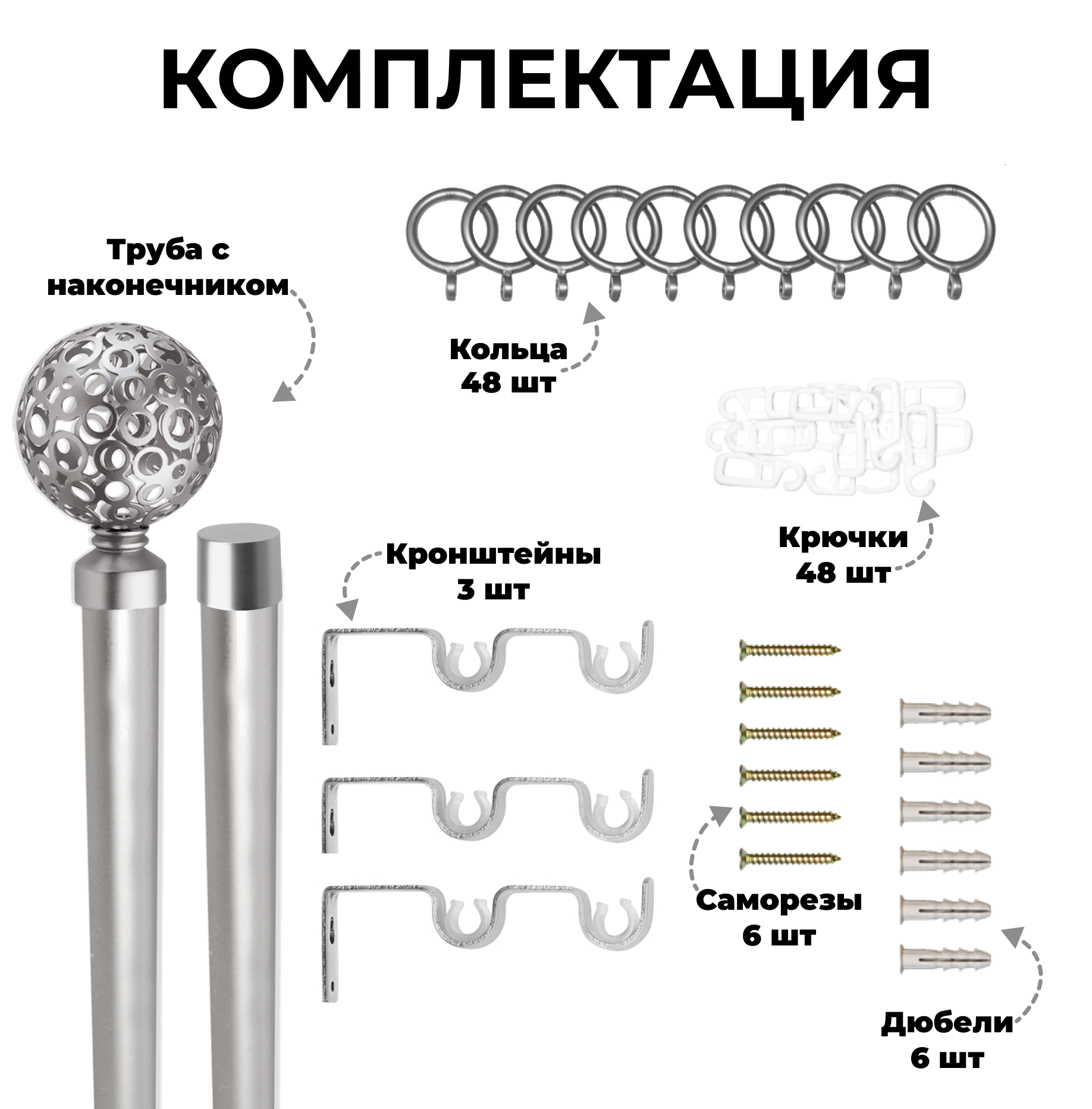 | Комплектация | Труба металлическая гладкая Ø16 мм - 2шт; Наконечники металлические - 2 шт; Заглушка - 2 шт; Кронштейны металлические; Кольца пластиковые + крючки; Комплект крепежа (дюбеля, шурупы). |