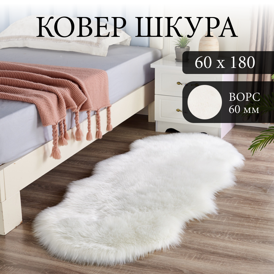 Ковер шкура на пол Einfil 60x180 см, белый мех, машинная работа, противоскользящая подошва информация: