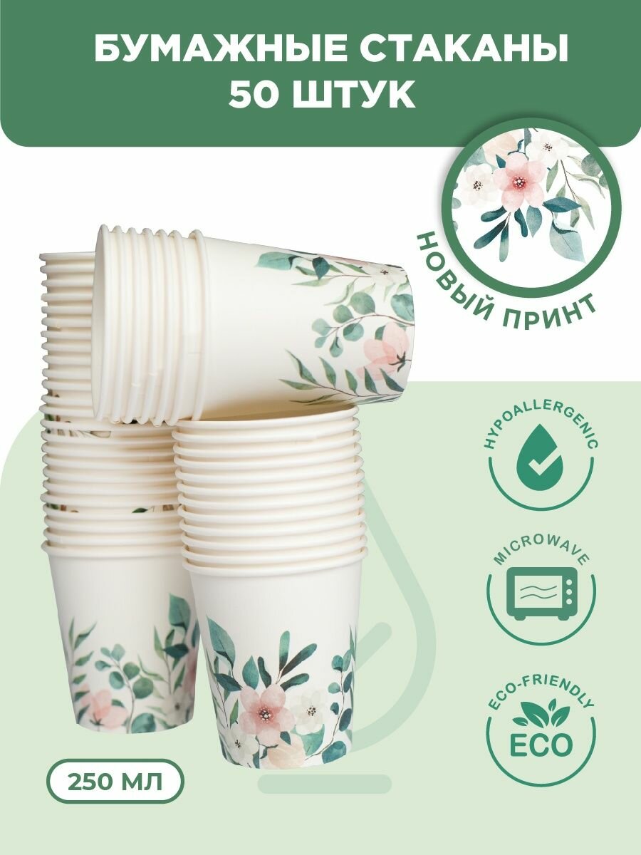 Стаканы одноразовые бумажные для кофе 250 мл набор 50 шт, принт "Цветы" 360 ₽
