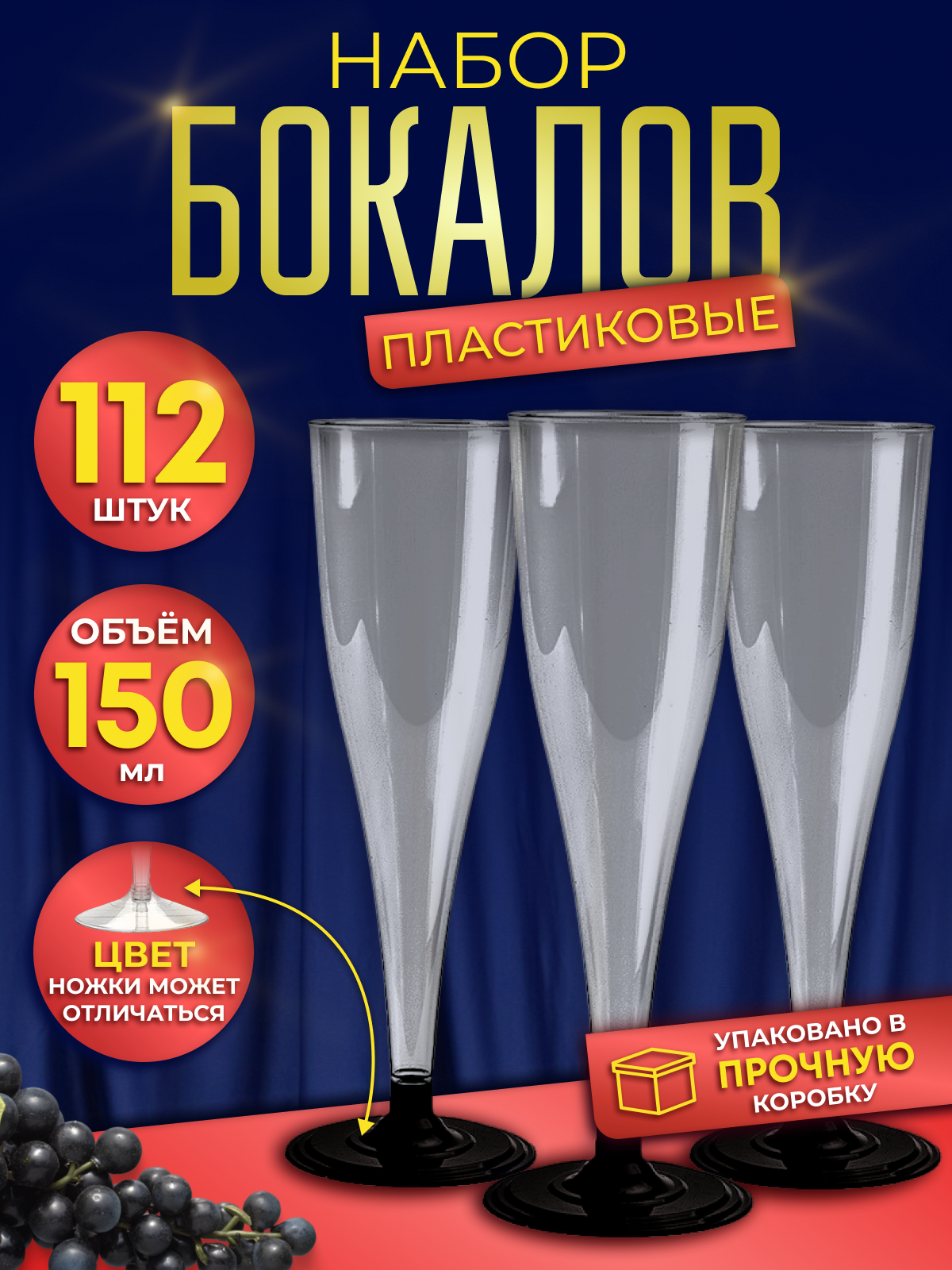 Бокалы пластиковые прозрачные одноразовые для шампанского на черной ножке 150 мл. Набор из 112шт разборных фужеров Флюте для прохладительных напитков информация: