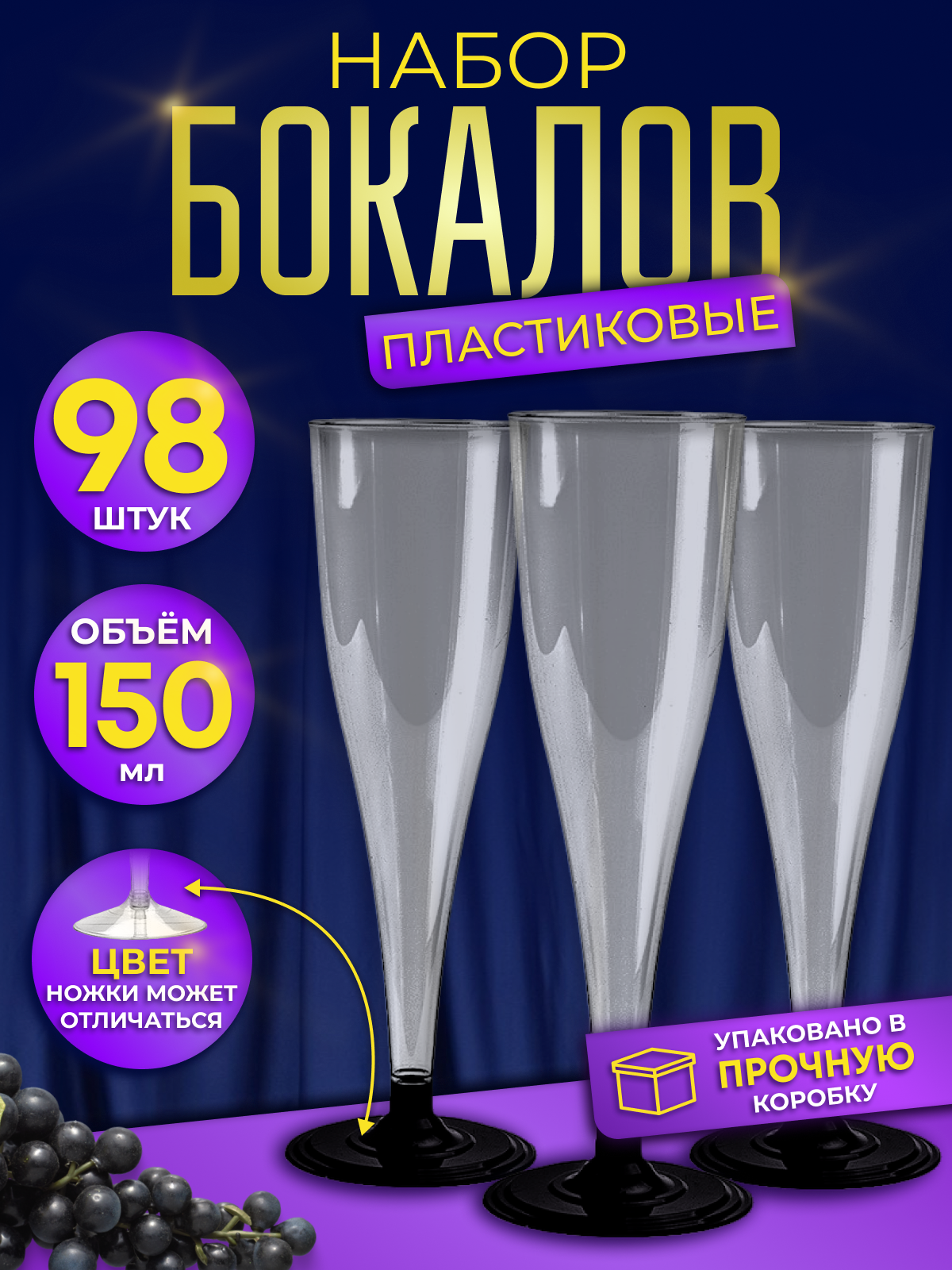 Бокалы пластиковые прозрачные одноразовые для шампанского на черной ножке 150 мл. Набор из 98 шт разборных фужеров Флюте для прохладительных напитков информация:
