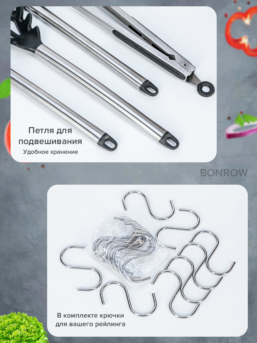| Комплектация | кулинарная лопатка, лопатка для жарки, лопатка для жарки с отверстиями для слива масла/воды, половник, шумовка, ложка для спагетти, венчик, кулинарные щипцы, нож для пиццы, овощечистка, ложка для мороженого, открывалка для консервов, открывалка для бутылок, пресс для чеснока, нож и терка для сыра; 17 - крючков для подвешивания; упаковка |