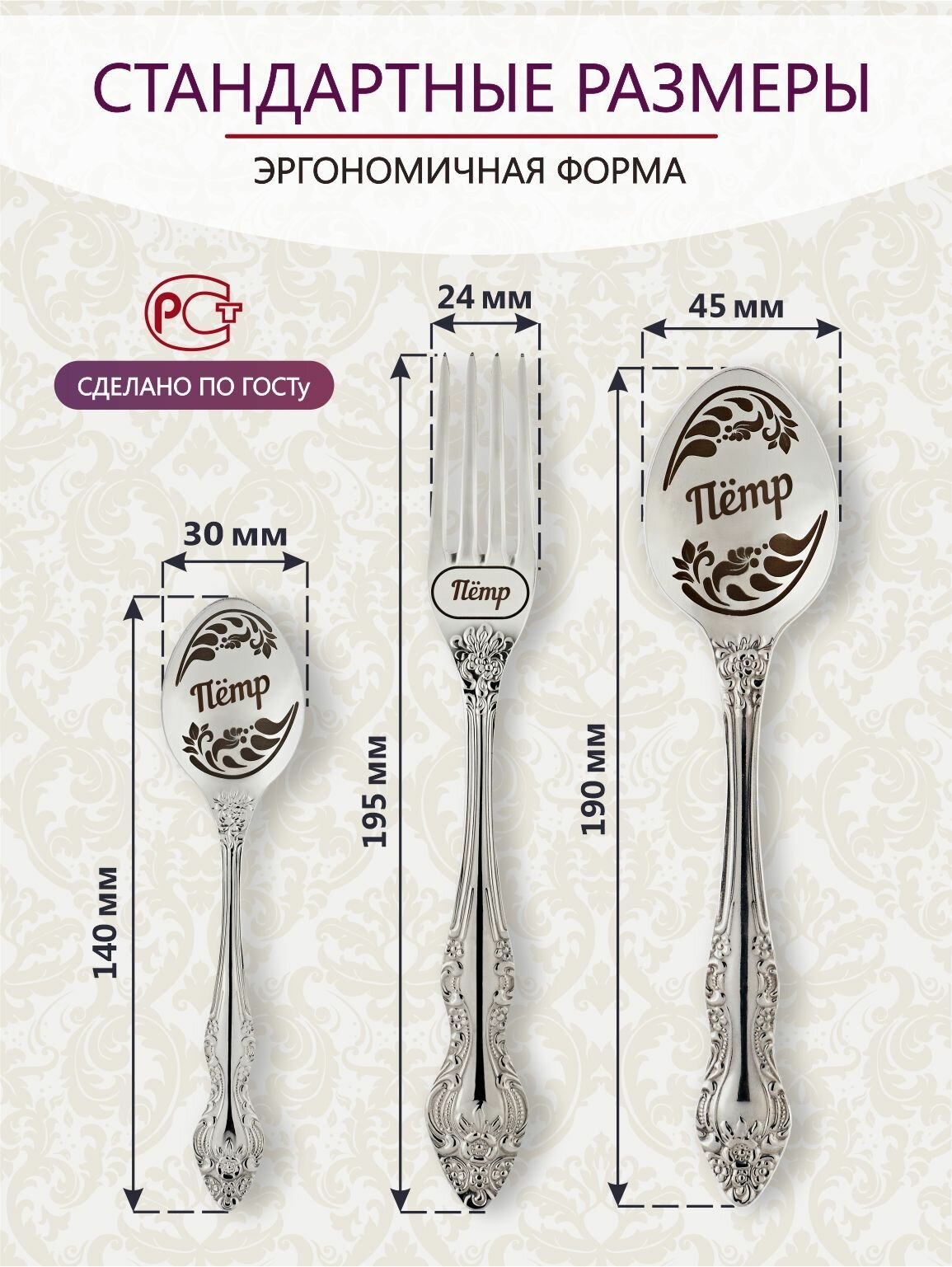 | В набор входит | Столовая ложка именная - 1 шт., столовая вилка именная - 1 шт., чайная ложка именная - 1 шт., деревянная резная подставка - 1 шт. |