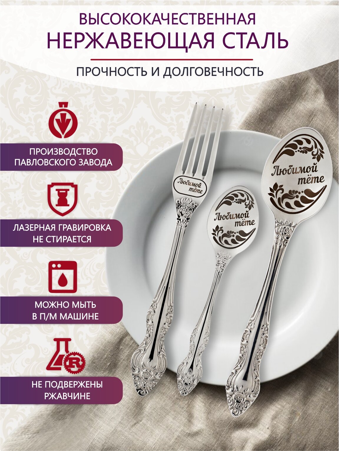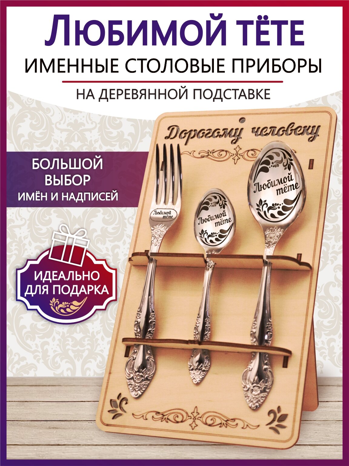 Отзывы на Подарочный столовый набор приборов Любимой тете из 3-х предметов на подставке
